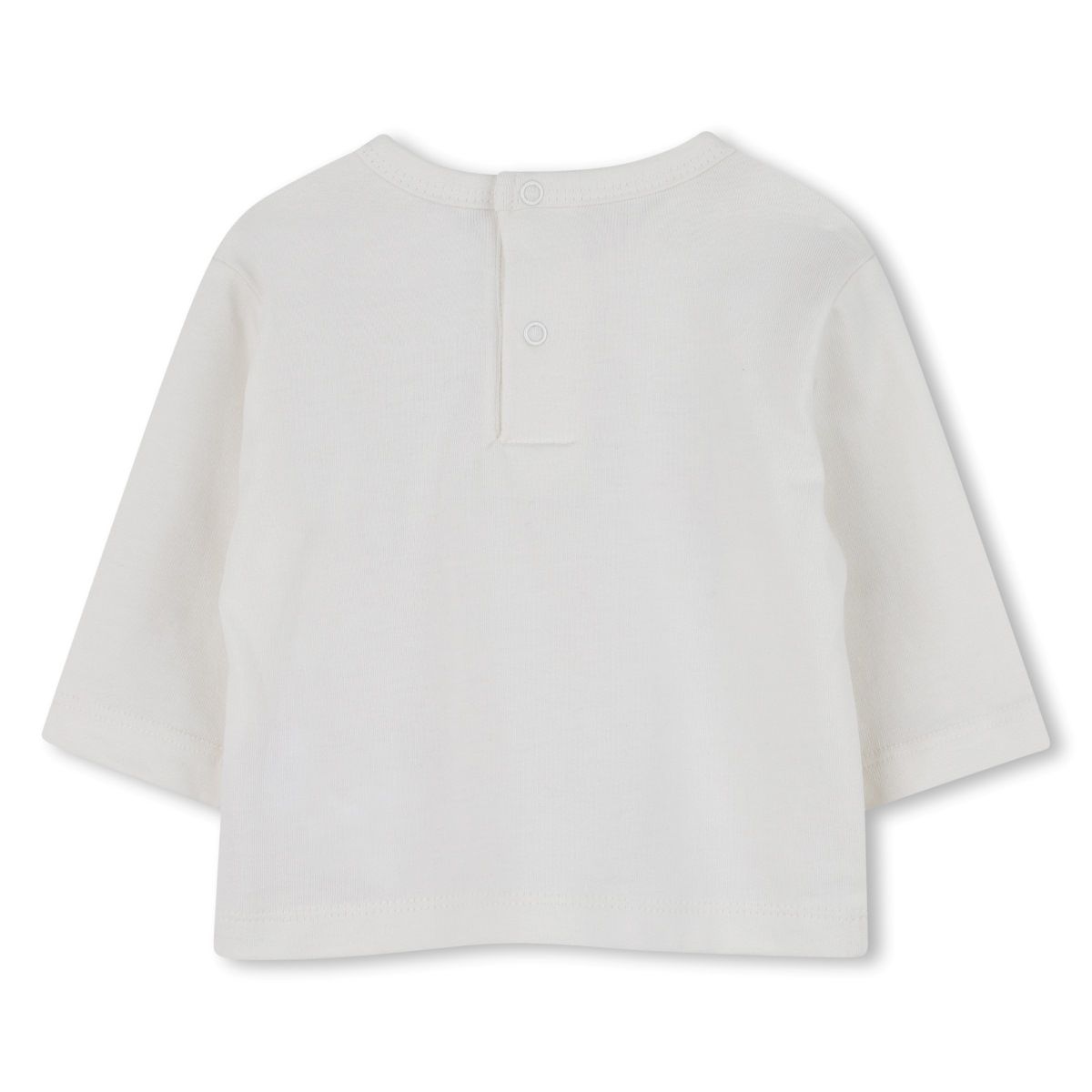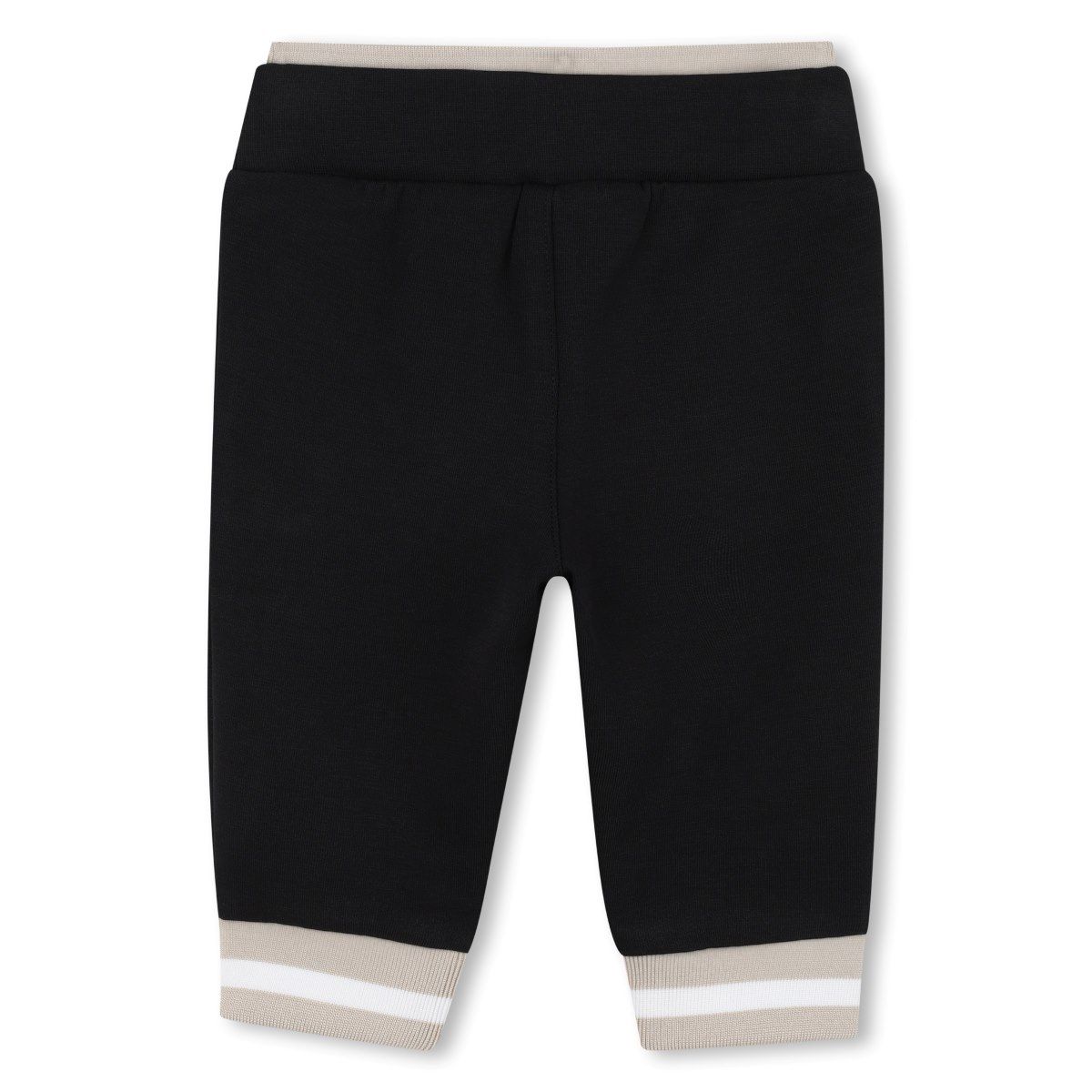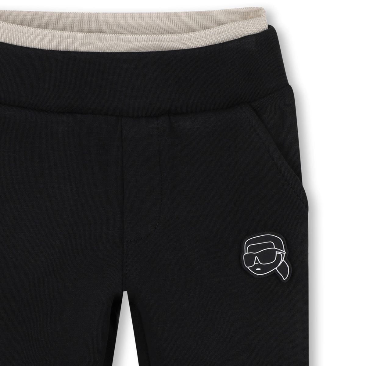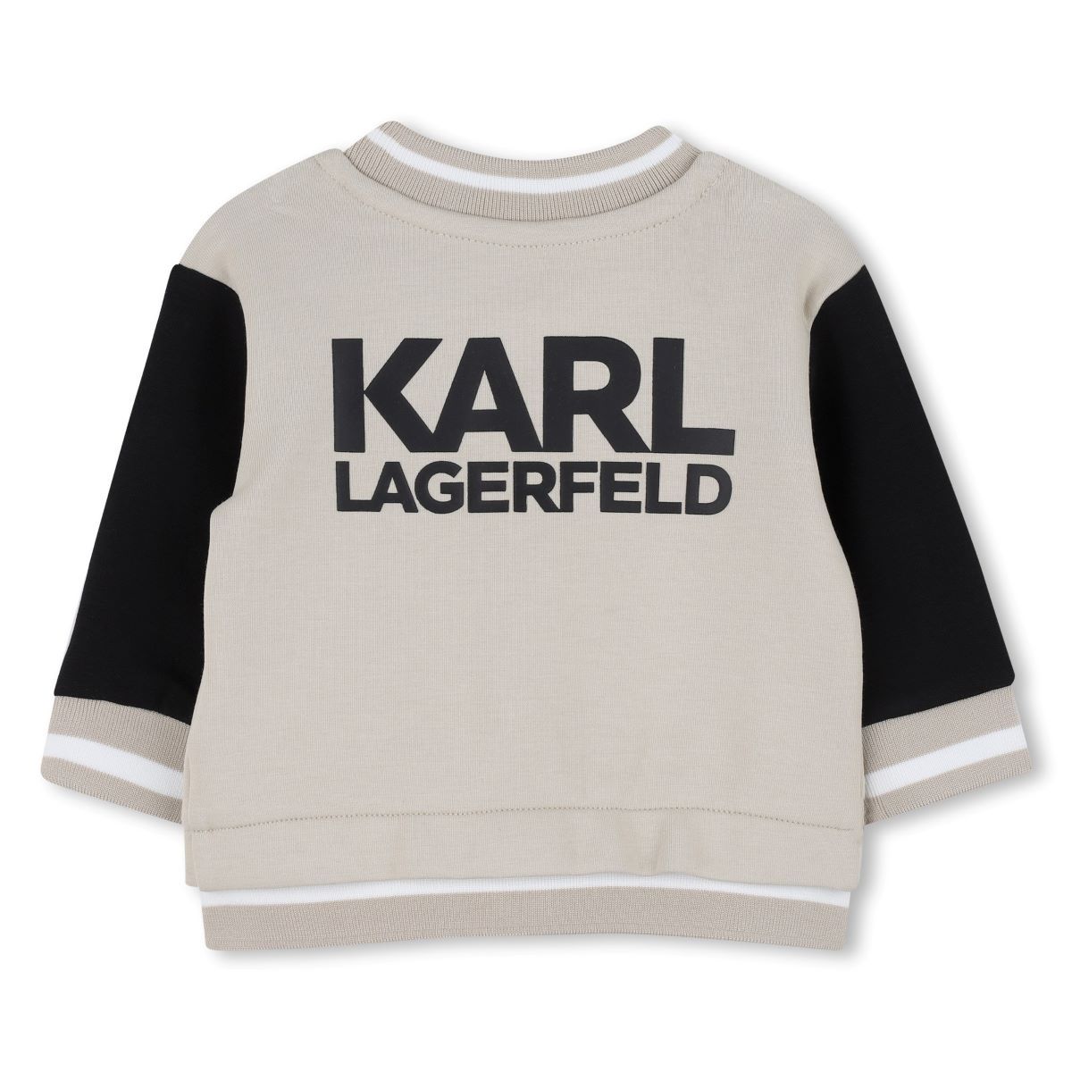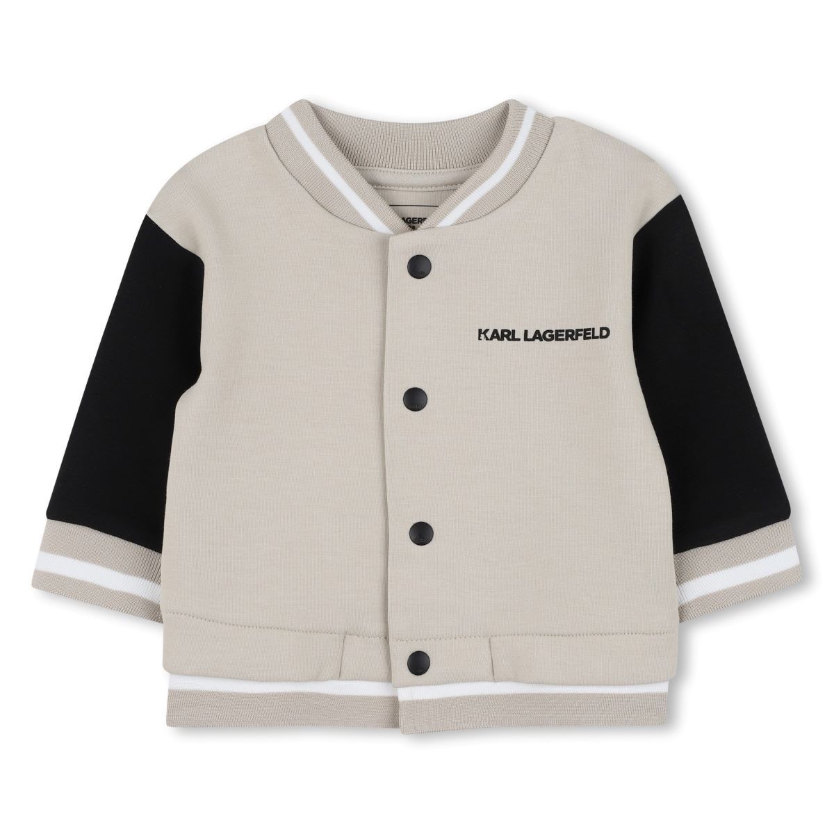 Комплект от три части в бежово и черно. Бомбър яке с лого на гърба, бяла блуза с Карлито и черно долнище.