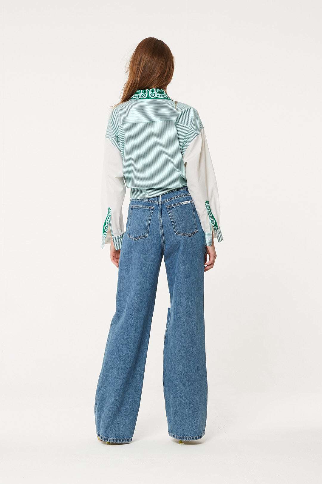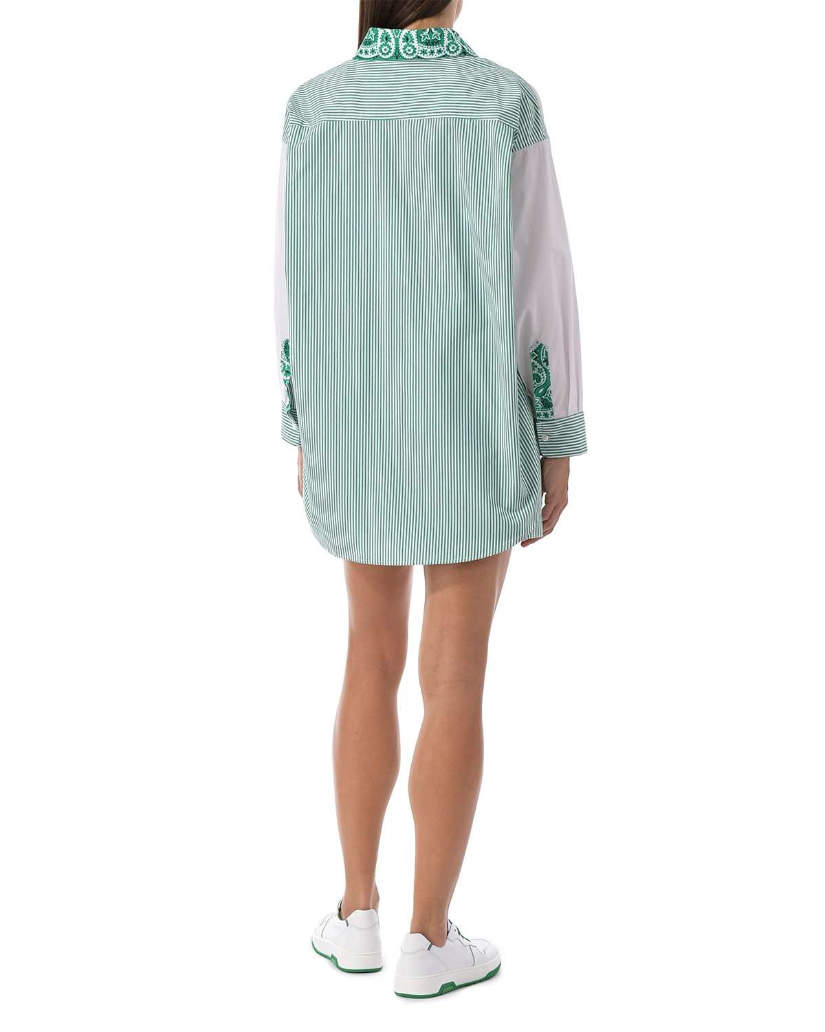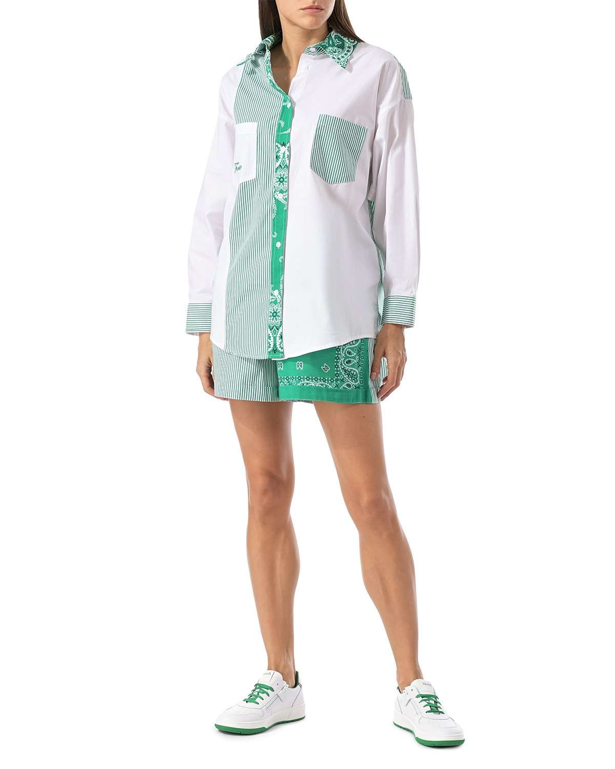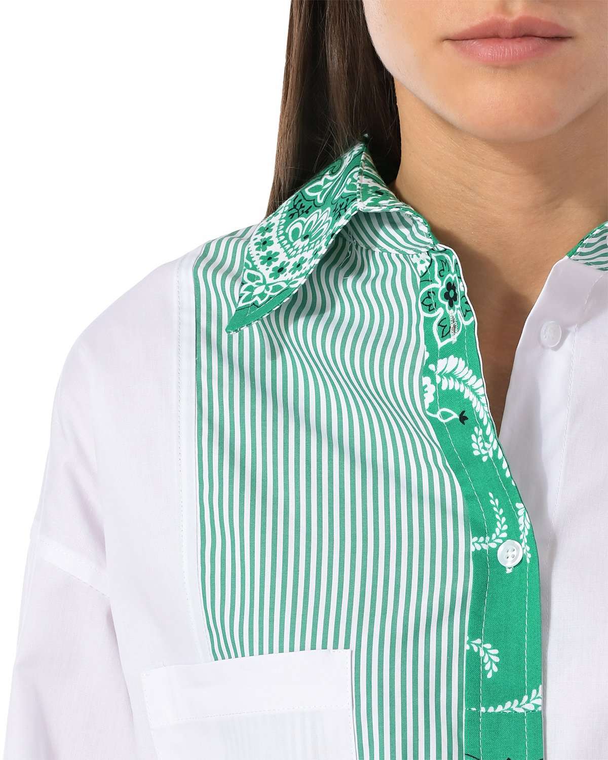 Бяла риза, свободен модел, с акцент бандана зелен принт на яката. Комбинация от зелено райе памук. Страничен голям джоб с бродирано лого.