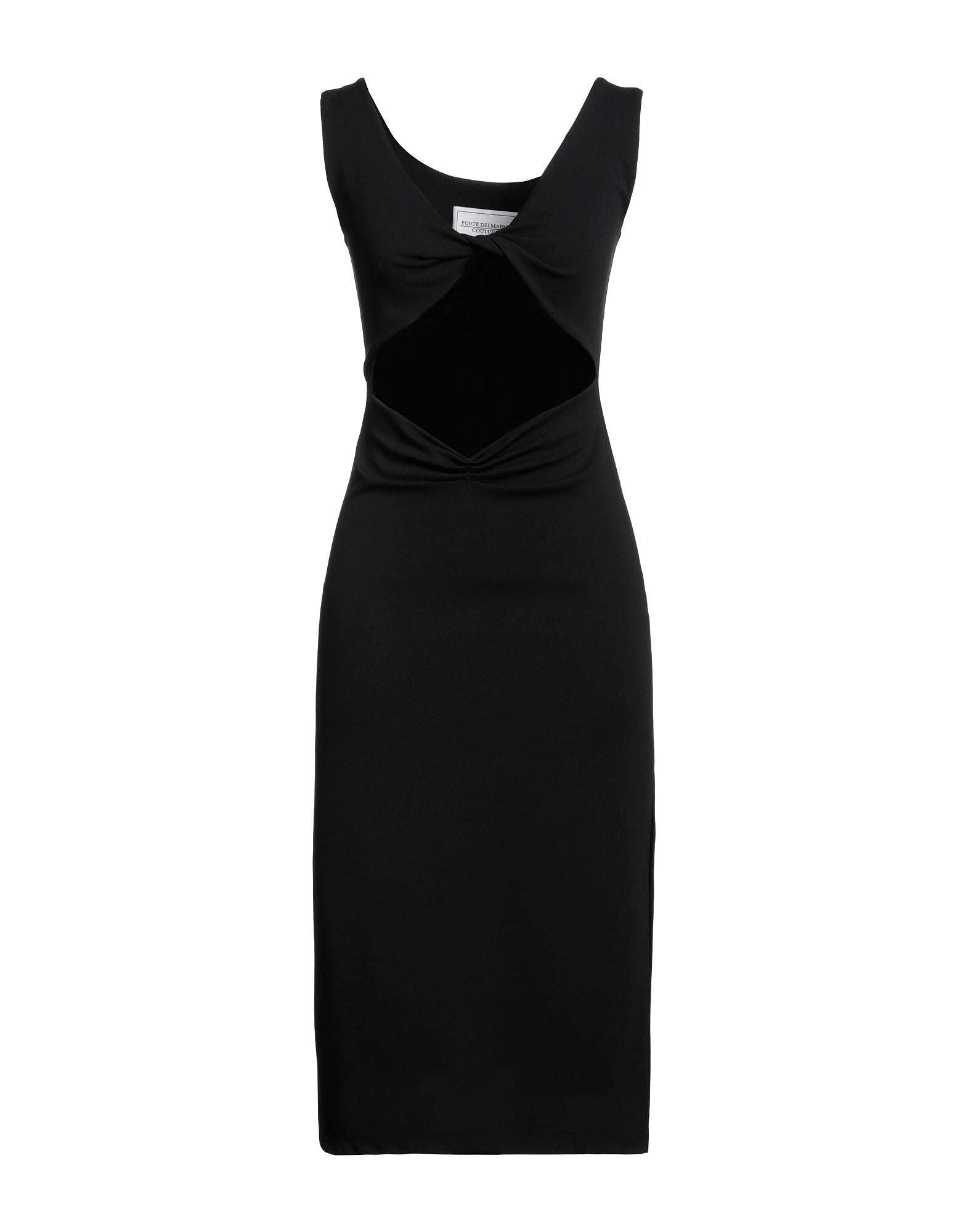 Черна еластична рокля с голям отвор. Роклята може да се носи с отворената част и изрязано деколте отпред или с отвора на гърба. Дължина до под коляното. Прав силует.