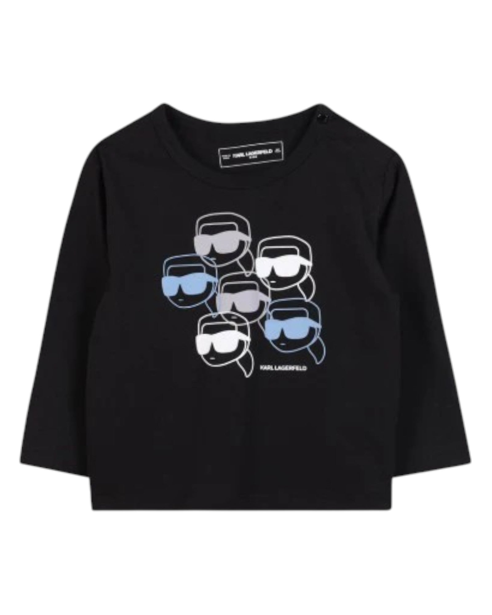 Черна блуза с дълъг ръкав, апликация с Карлито в синьо и сиво.