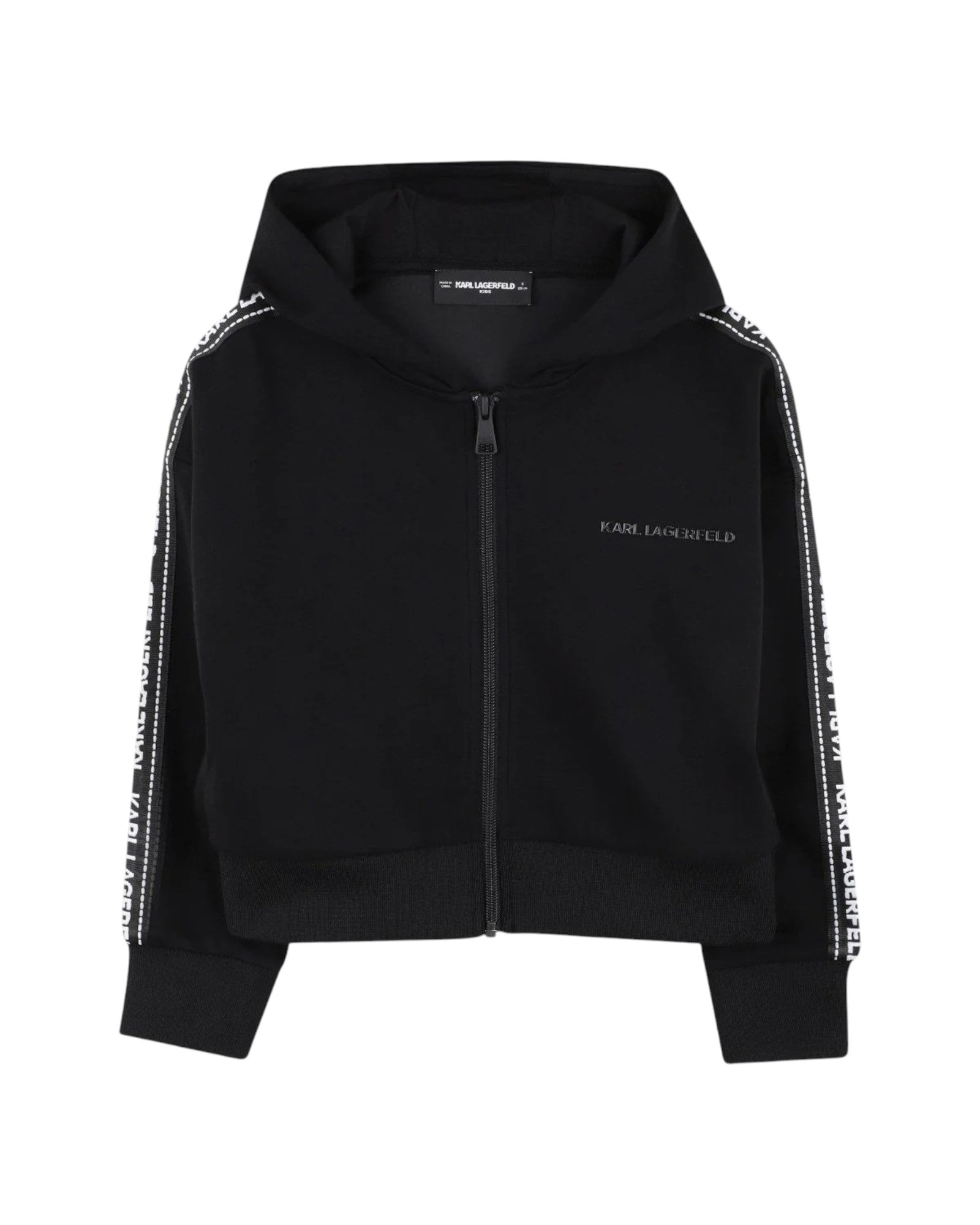 Черен суитчър с качулка. Бели кантове с лого.