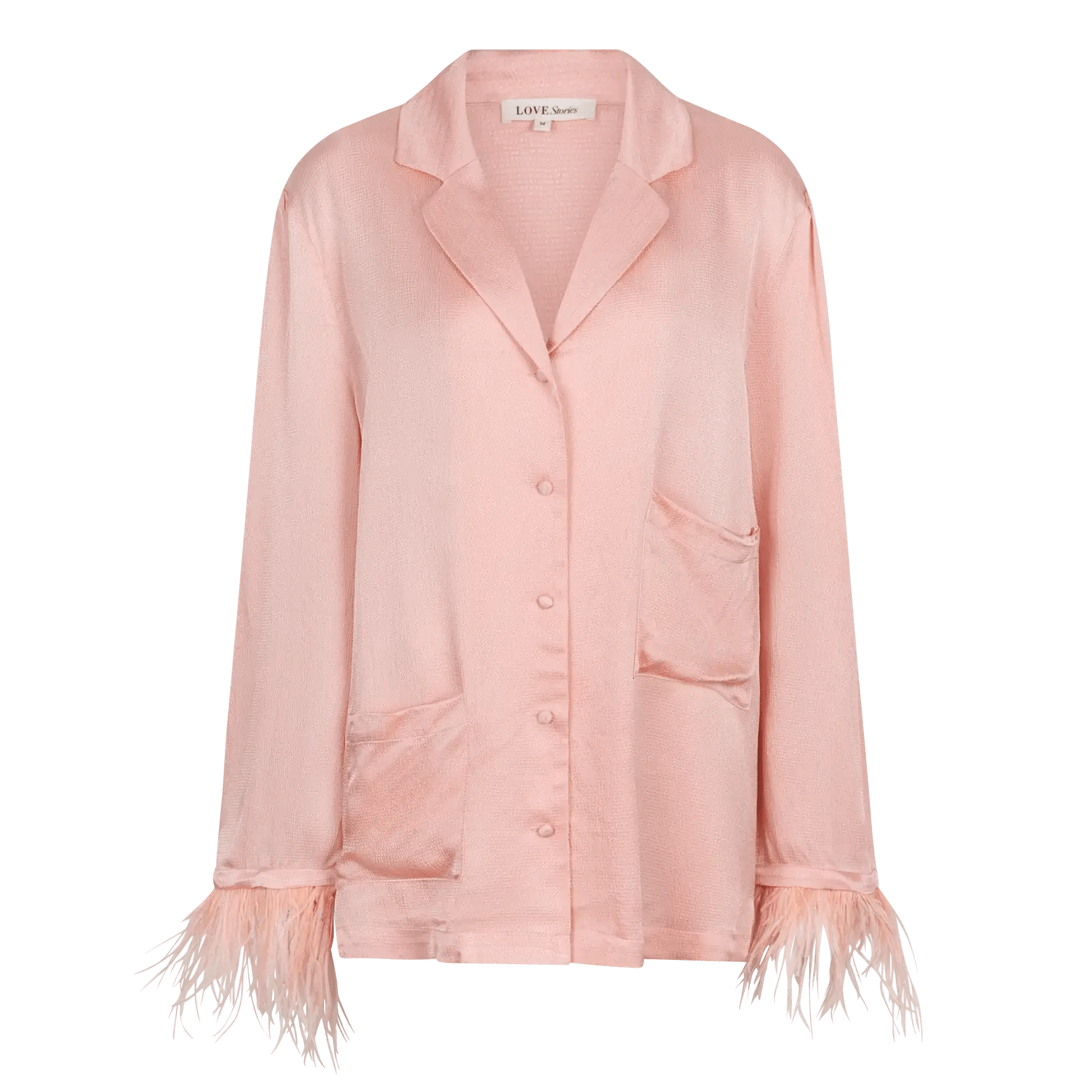 Светлорозов сатенен комплект с пера от две части. Риза с копчета и панталон.
