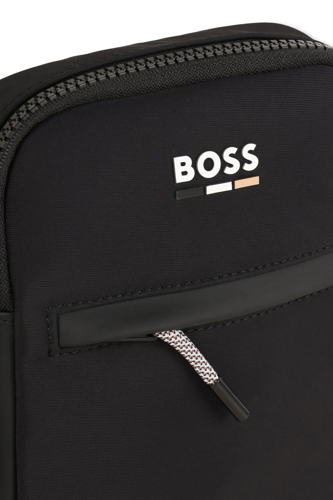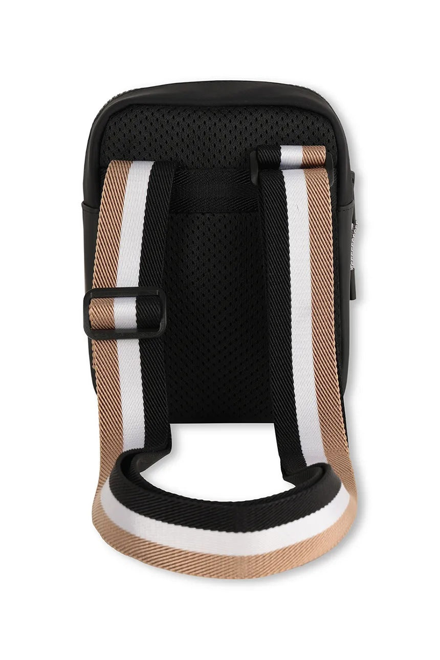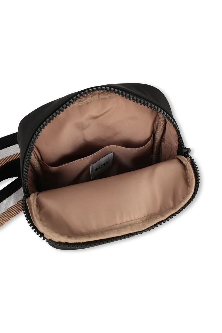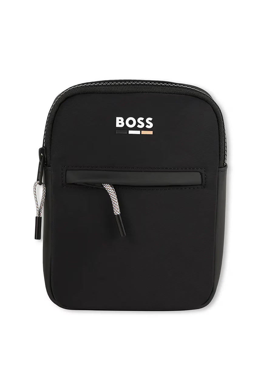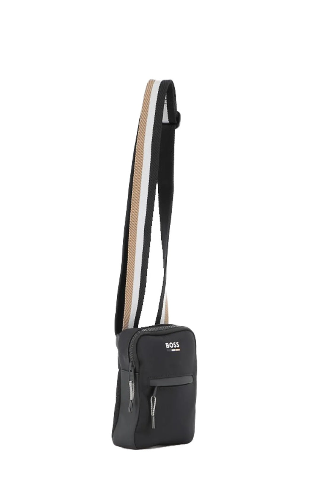 Черна чанта с малко бяло лого. Дръжка в черно, бяло и бежово.