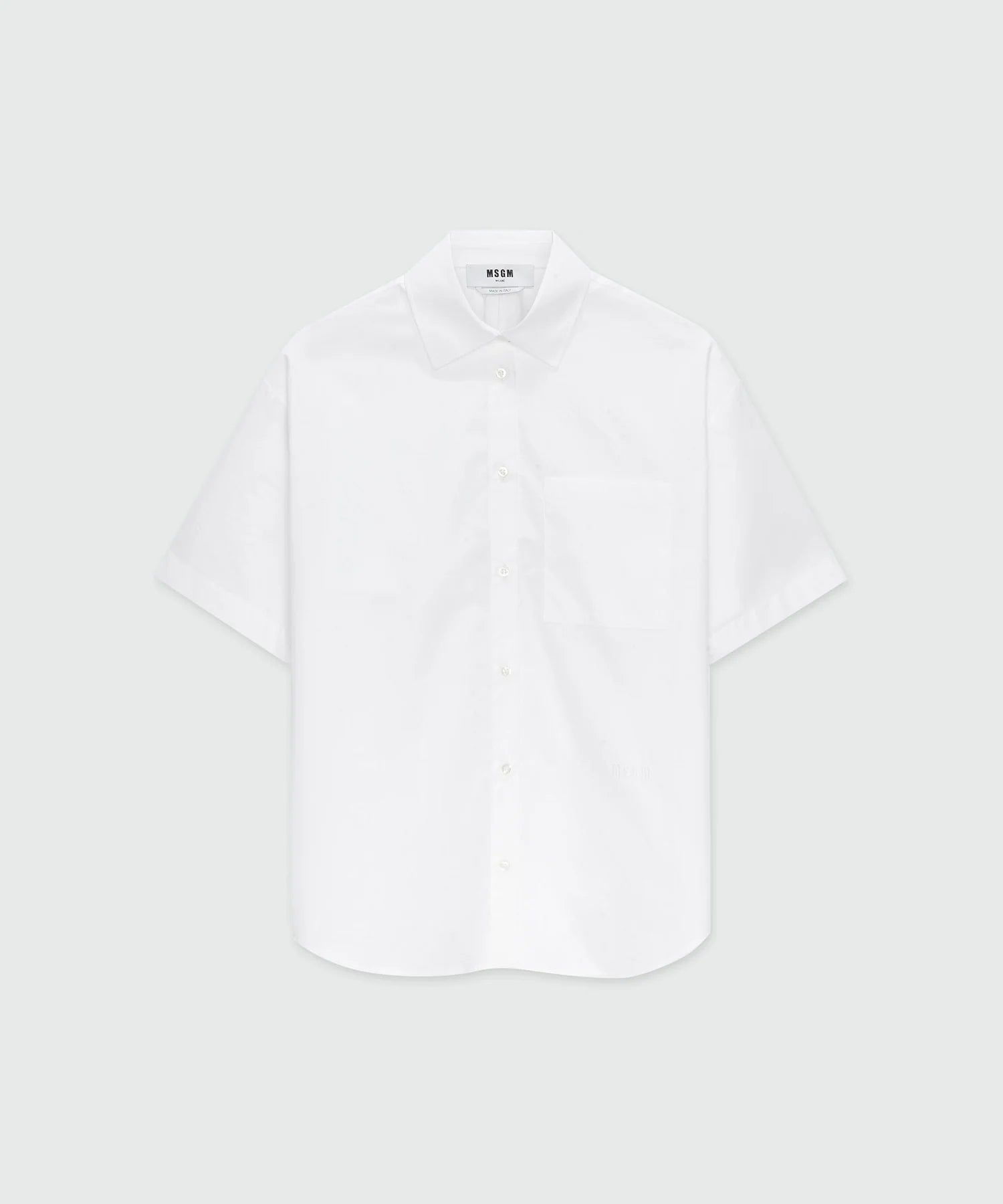 Бяла свободна риза с къс ръкав. Oтворен гръб с жълта, контрастираща лента.