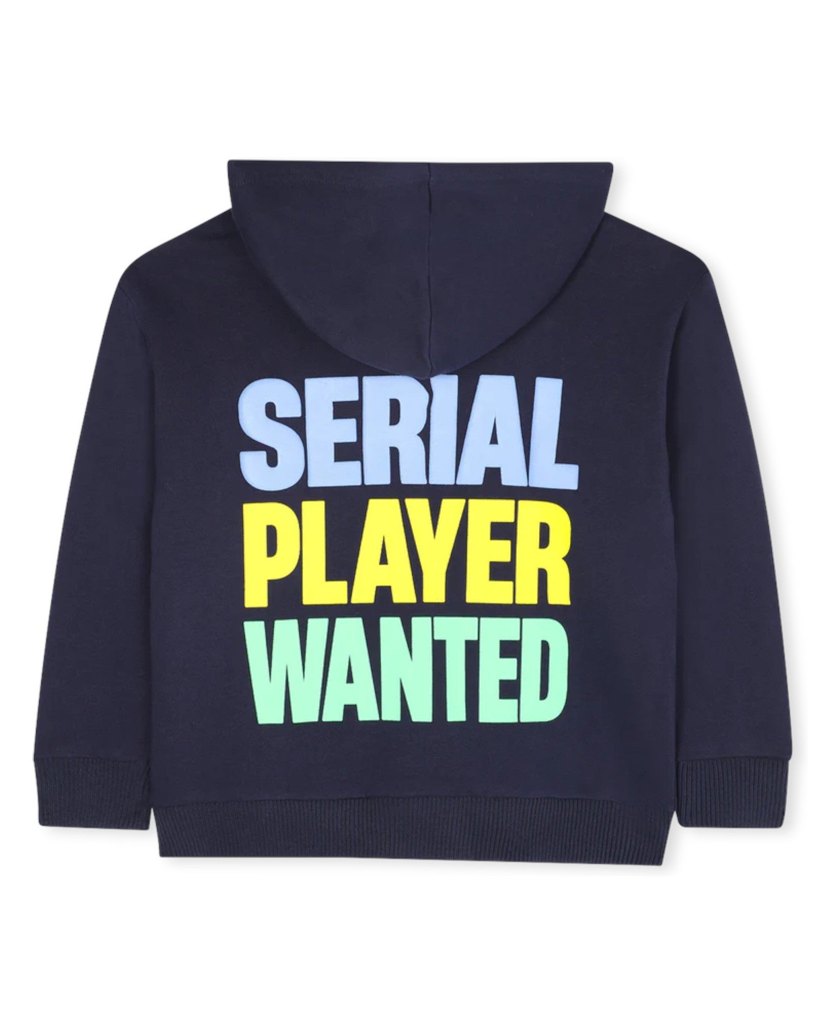 Тъмносин суитчер с качулка. Цветен надпис на гърба.