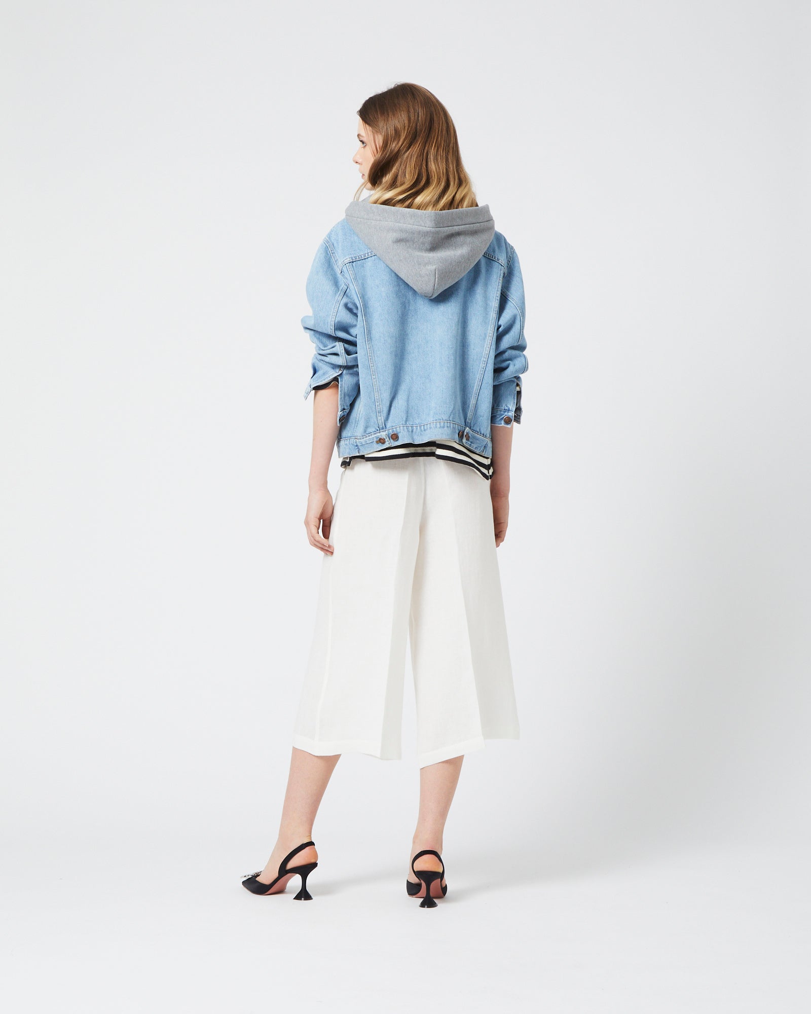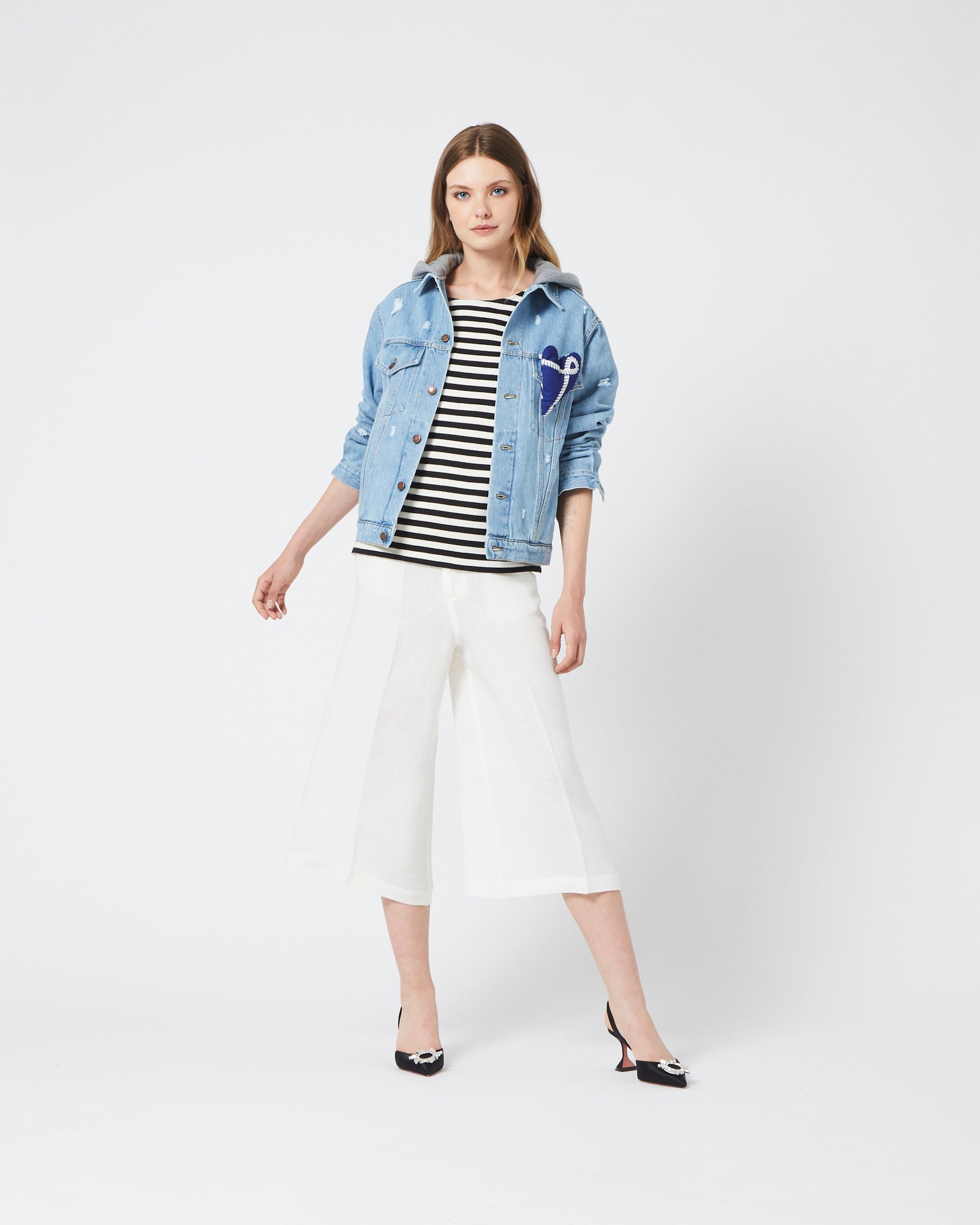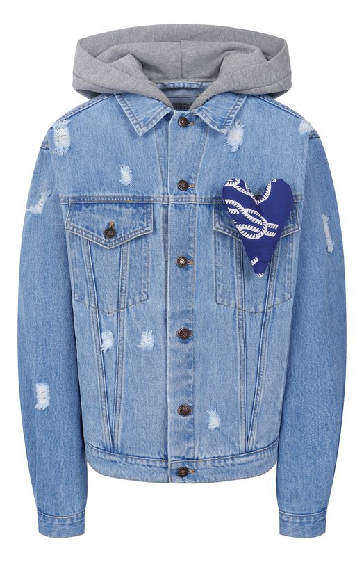 Синьо деним бомбър яке със сива качулка. Голямо сърце със синьо-бели мотиви.