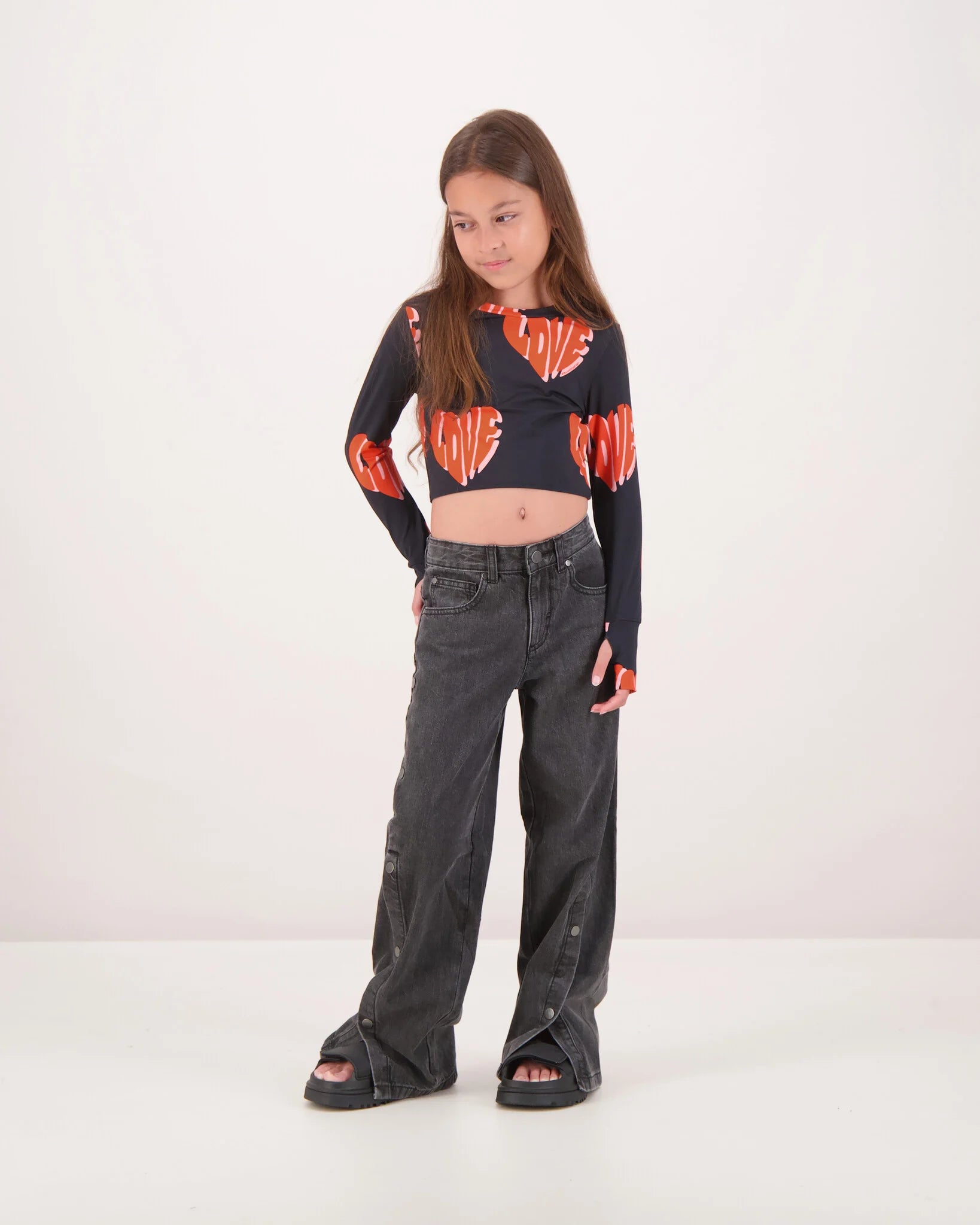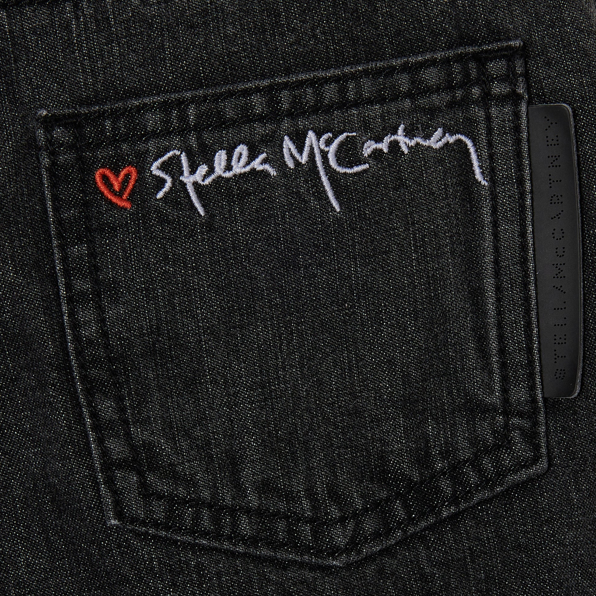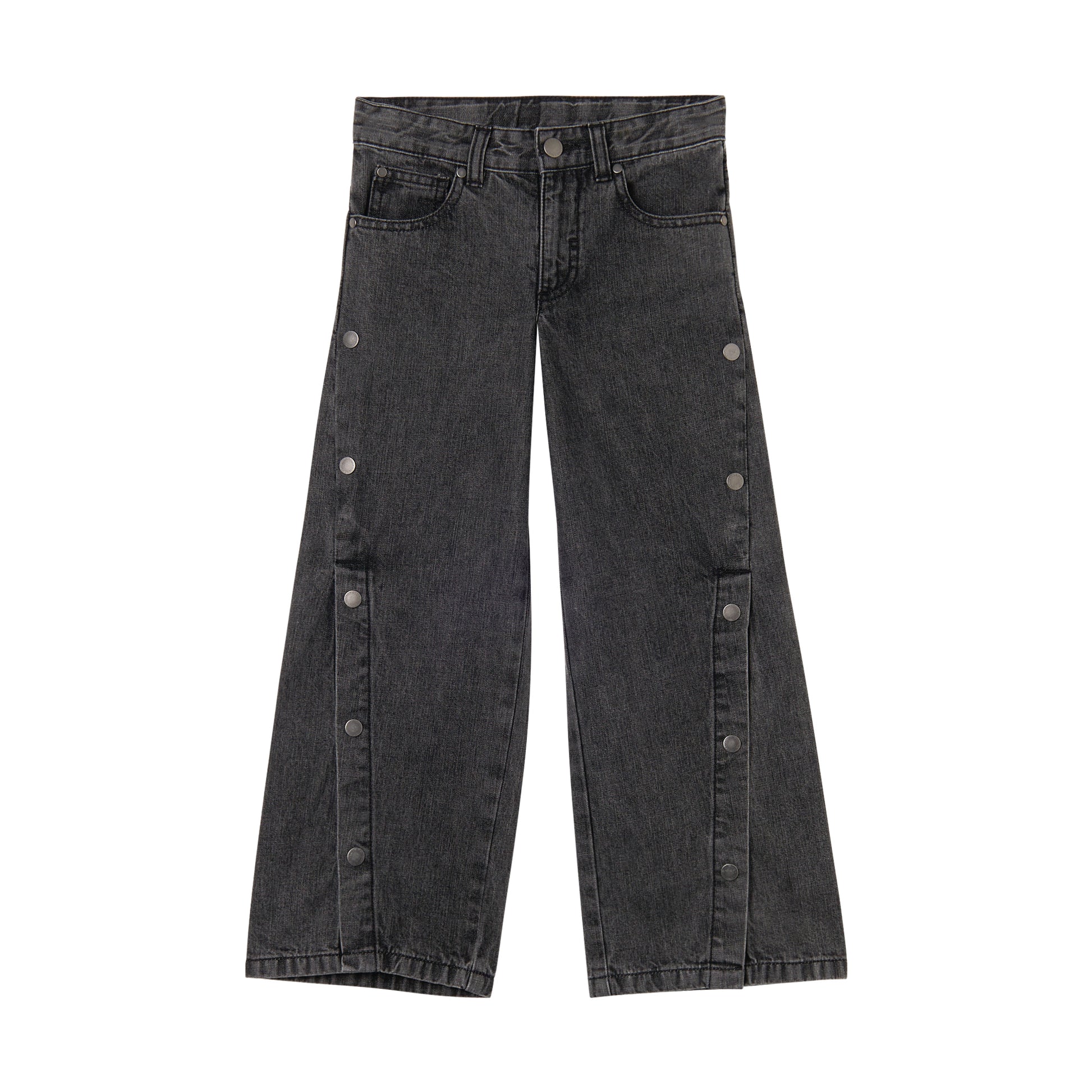 Черни дънки с копчета по крачолите. Бяло ръкописно лого на задния джоб.