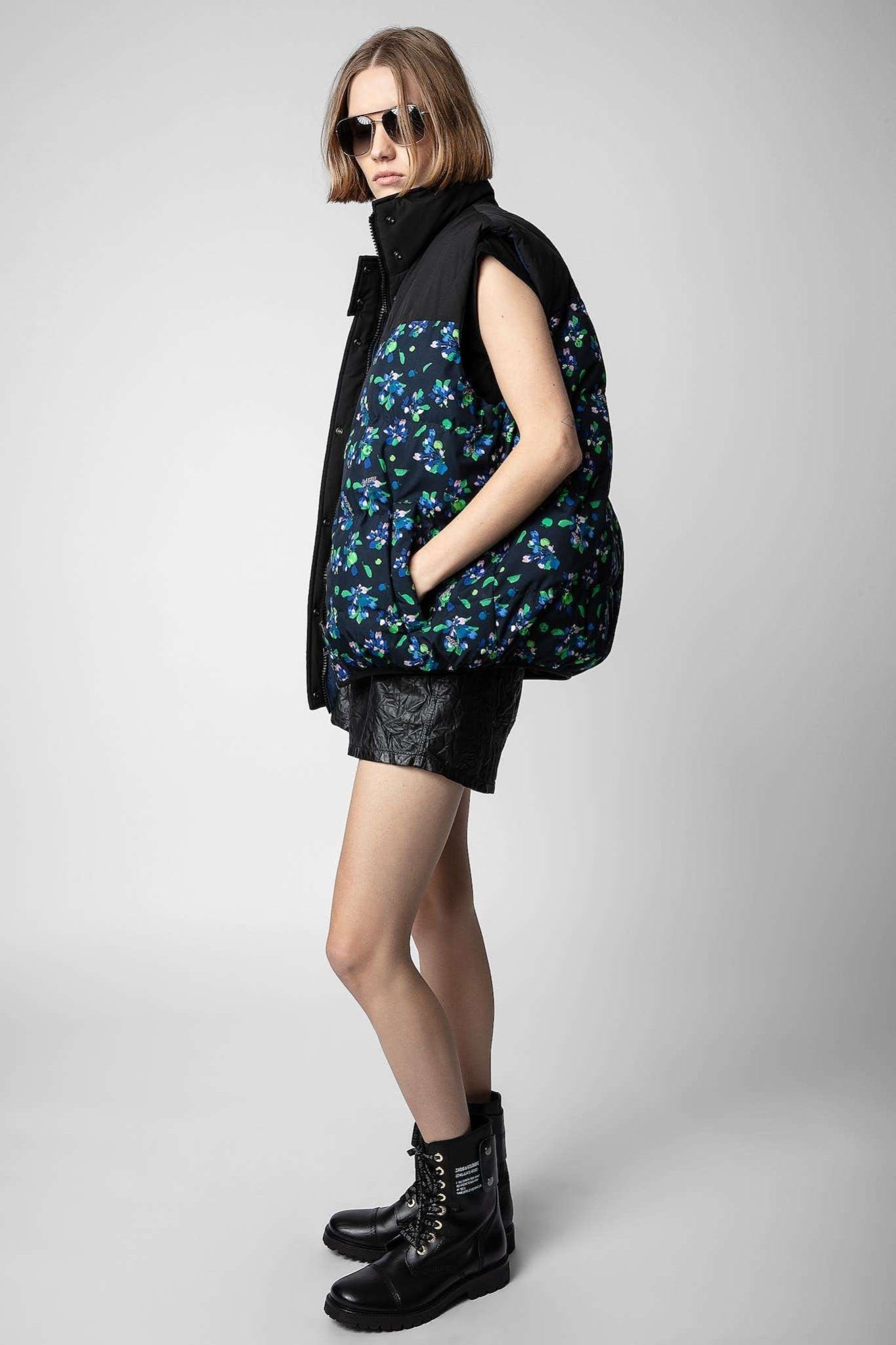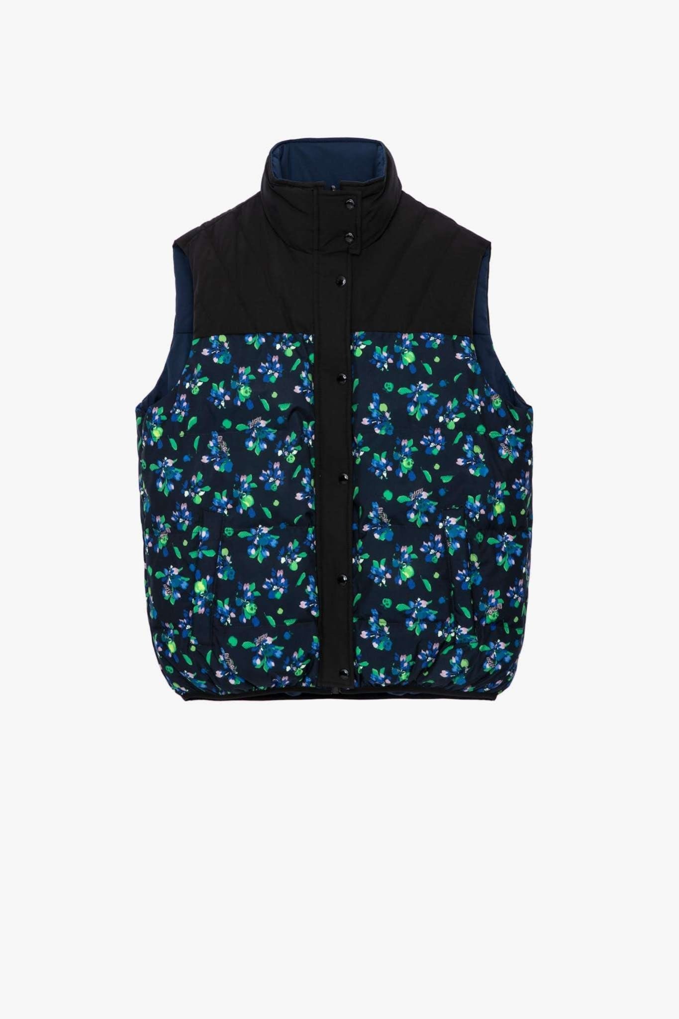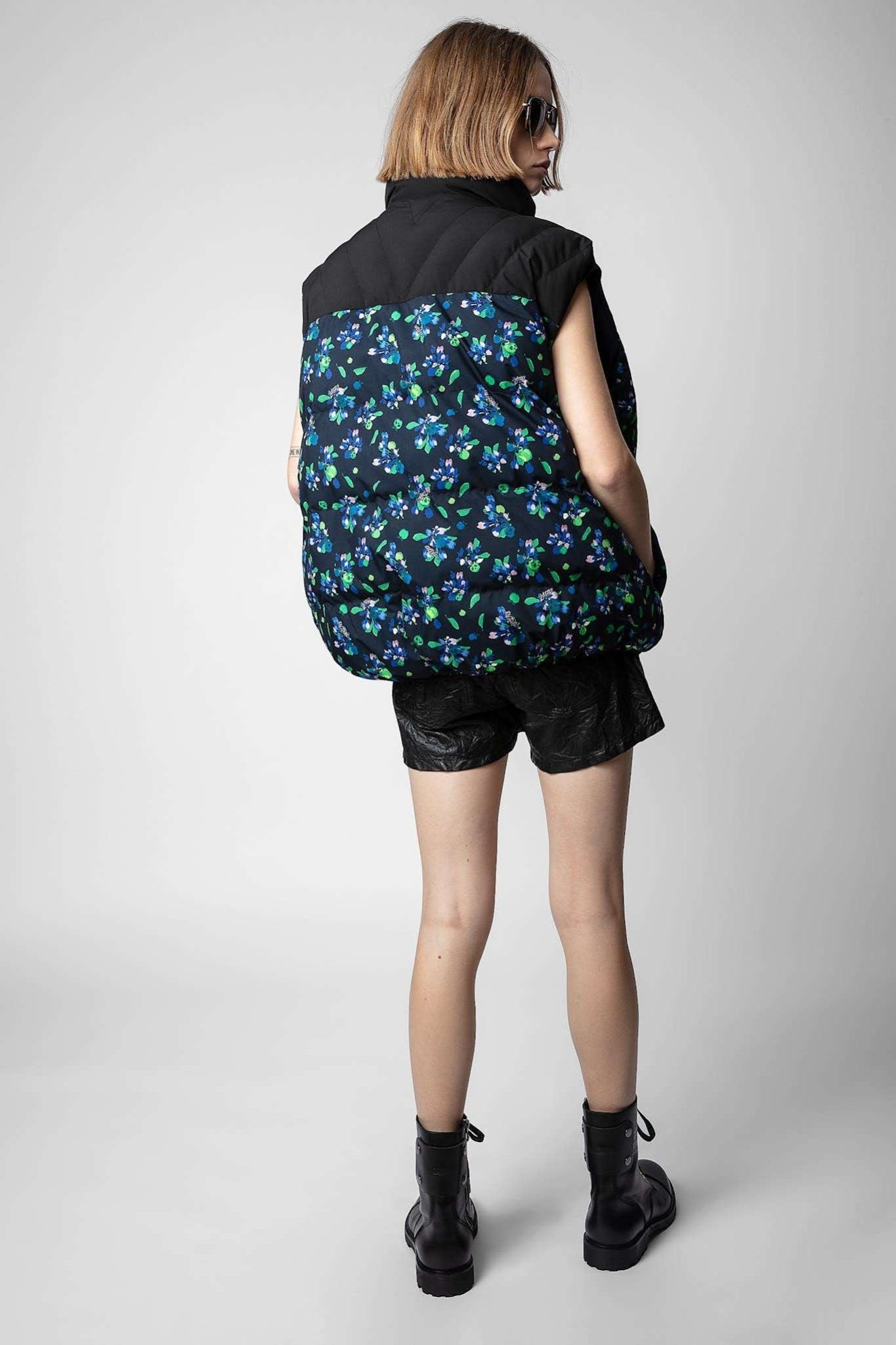 Двулицев пухен елек. Черен с контрастиращи сини цветя от едната страна. От другата страна в тъмносин цвят с черни блестящи крила, емблема. Висока яка, странични джобове. Моделът е леко оголемен.