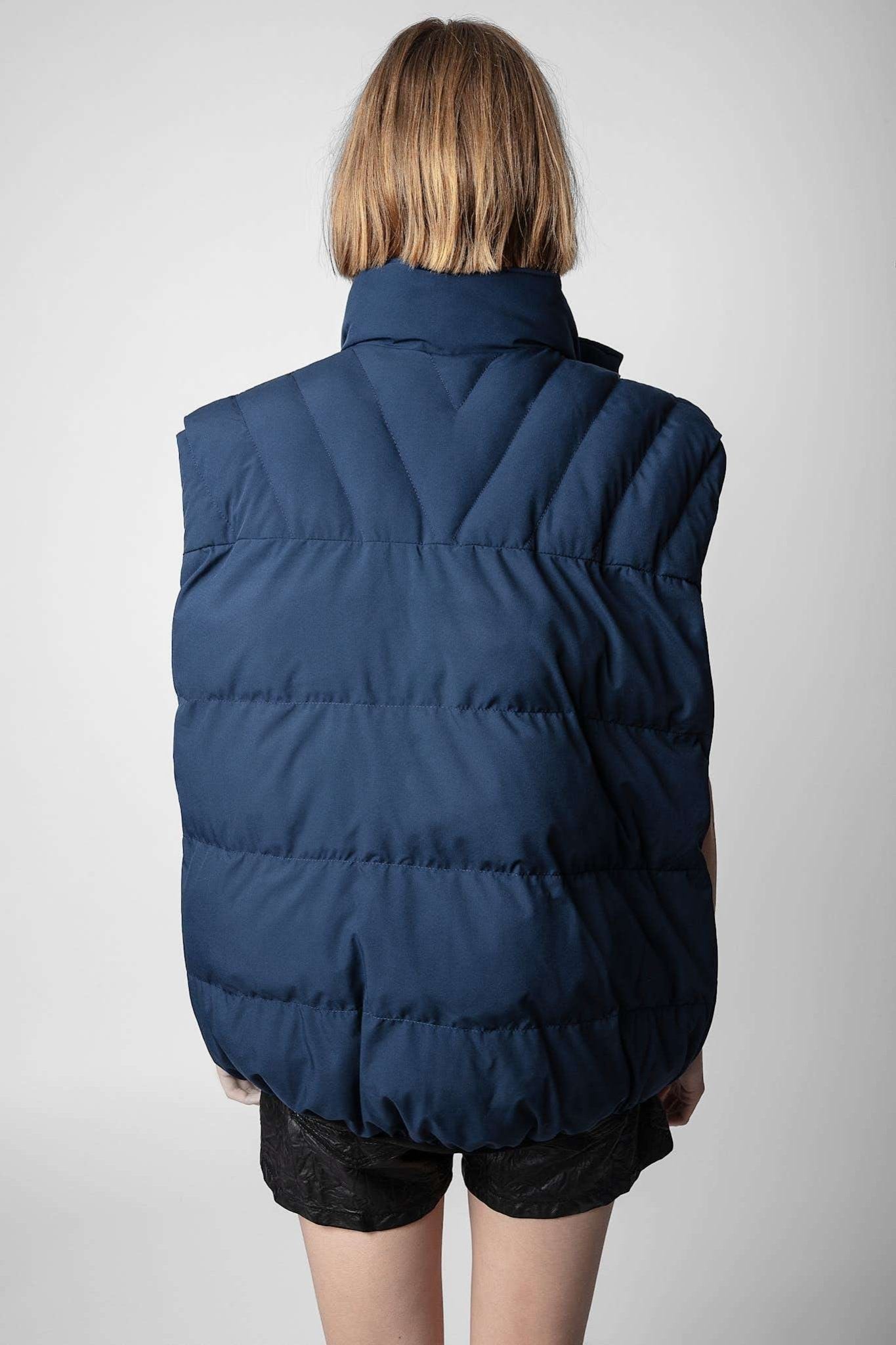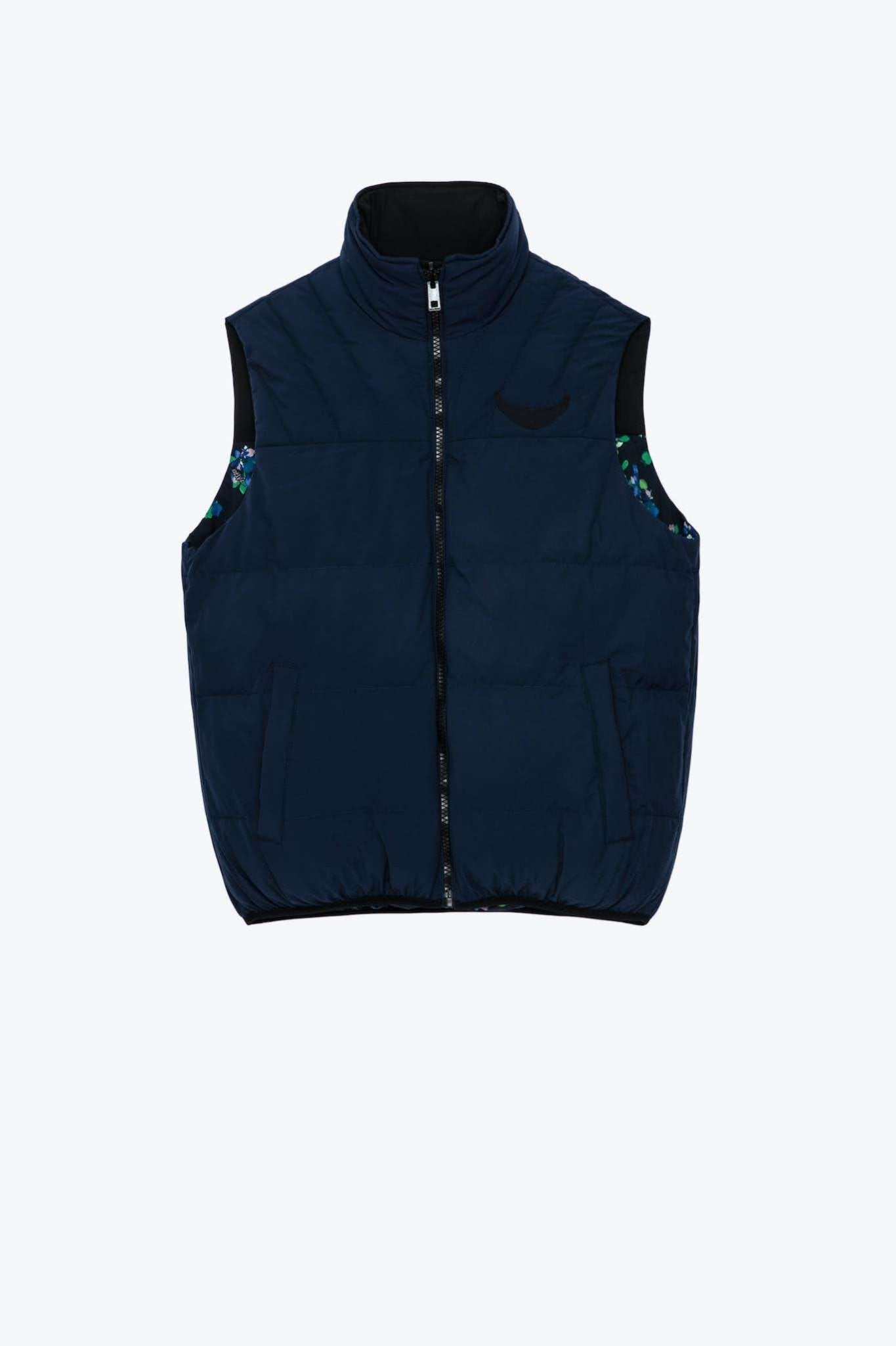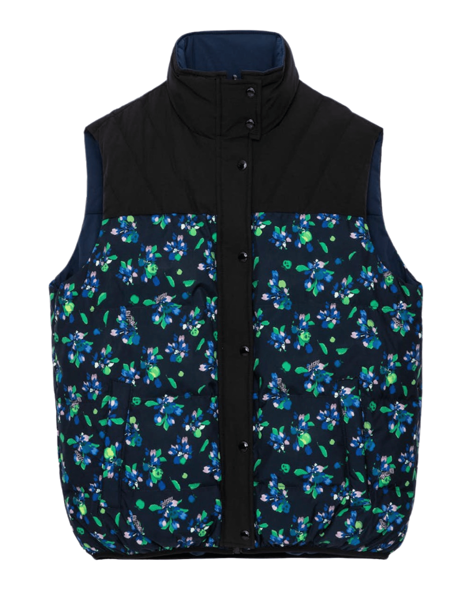Двулицев пухен елек. Черен с контрастиращи сини цветя от едната страна. От другата страна в тъмносин цвят с черни блестящи крила, емблема. Висока яка, странични джобове. Моделът е леко оголемен.