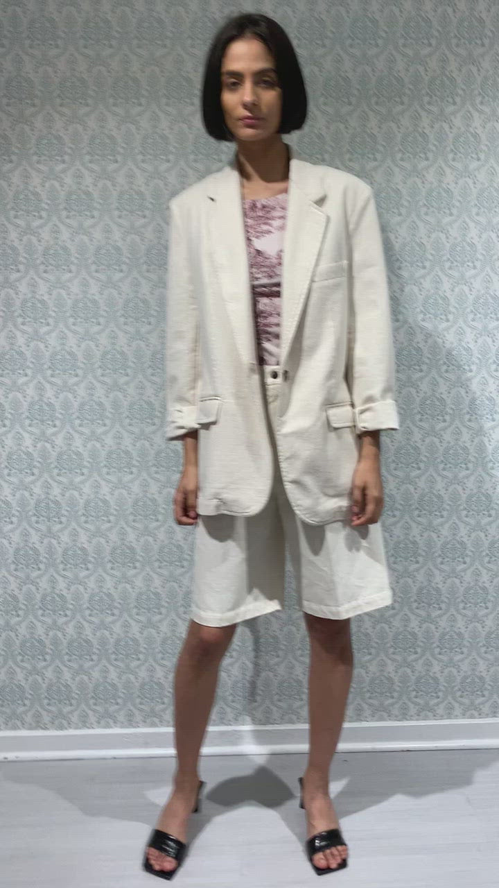 Бермуди с висока талия в екрю цвят. Права кройка, гайки на талията за възможност на носене с колан. Зашит джоб отзад.