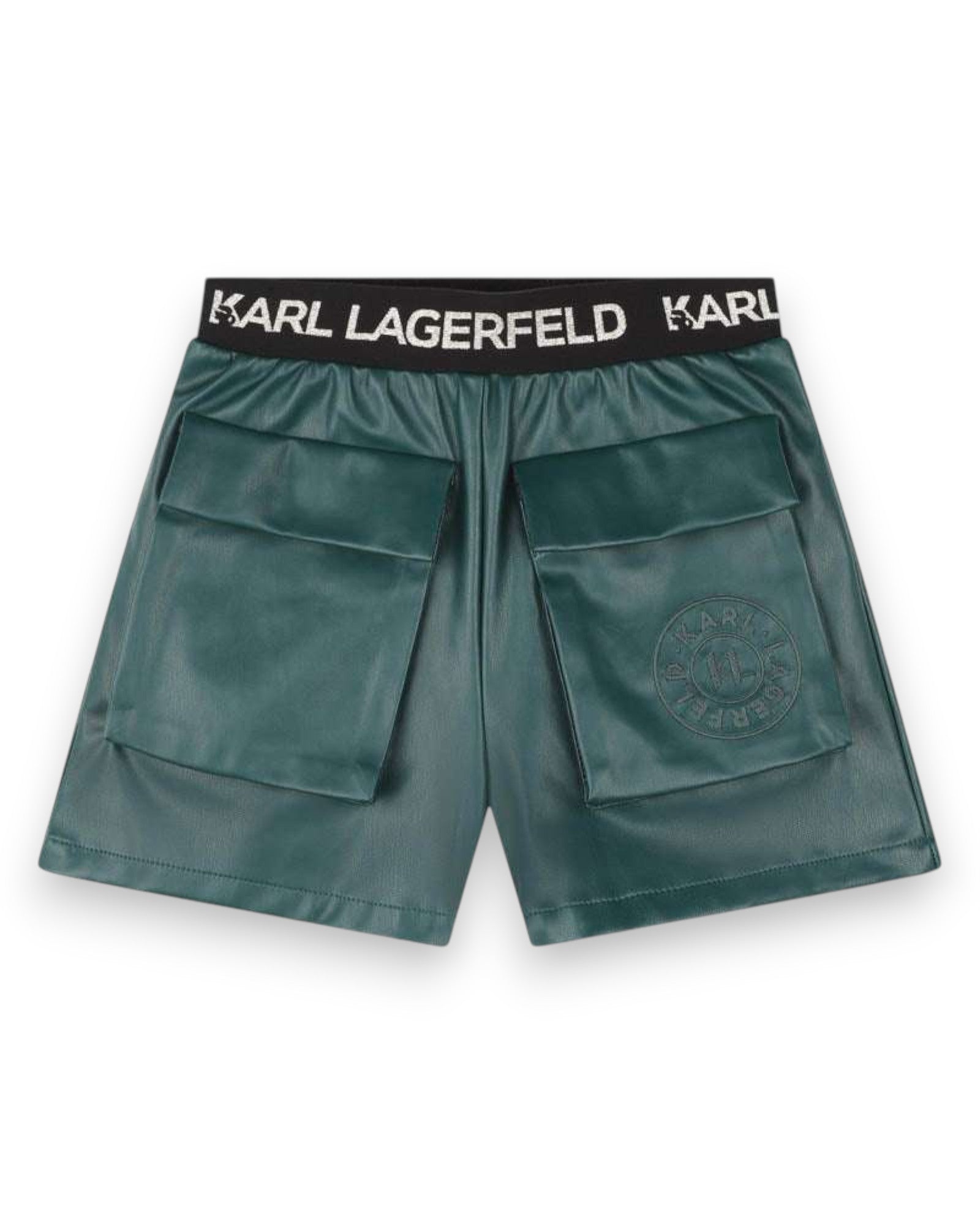 Зелени къси панталони от еко кожа. Черен ластик с лого на талията, големи предни джобове.
