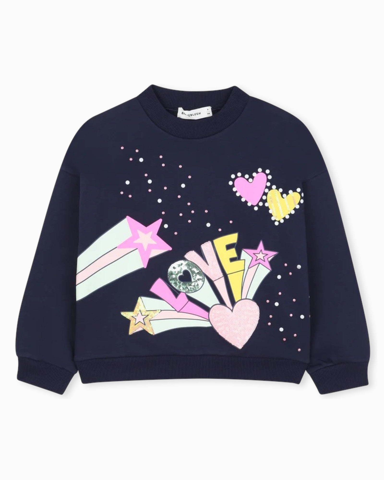 Тъмносин блузон с многоцветен принт и надпис.