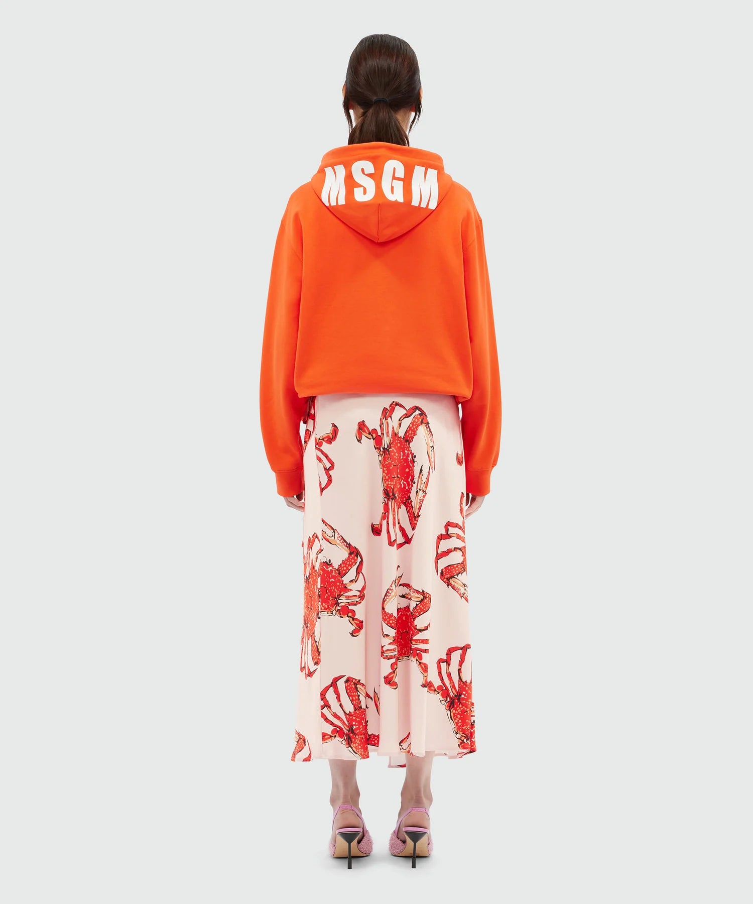 Миди пола в розов цвят, от лек вискозен сатен. Принт от червени раци.
