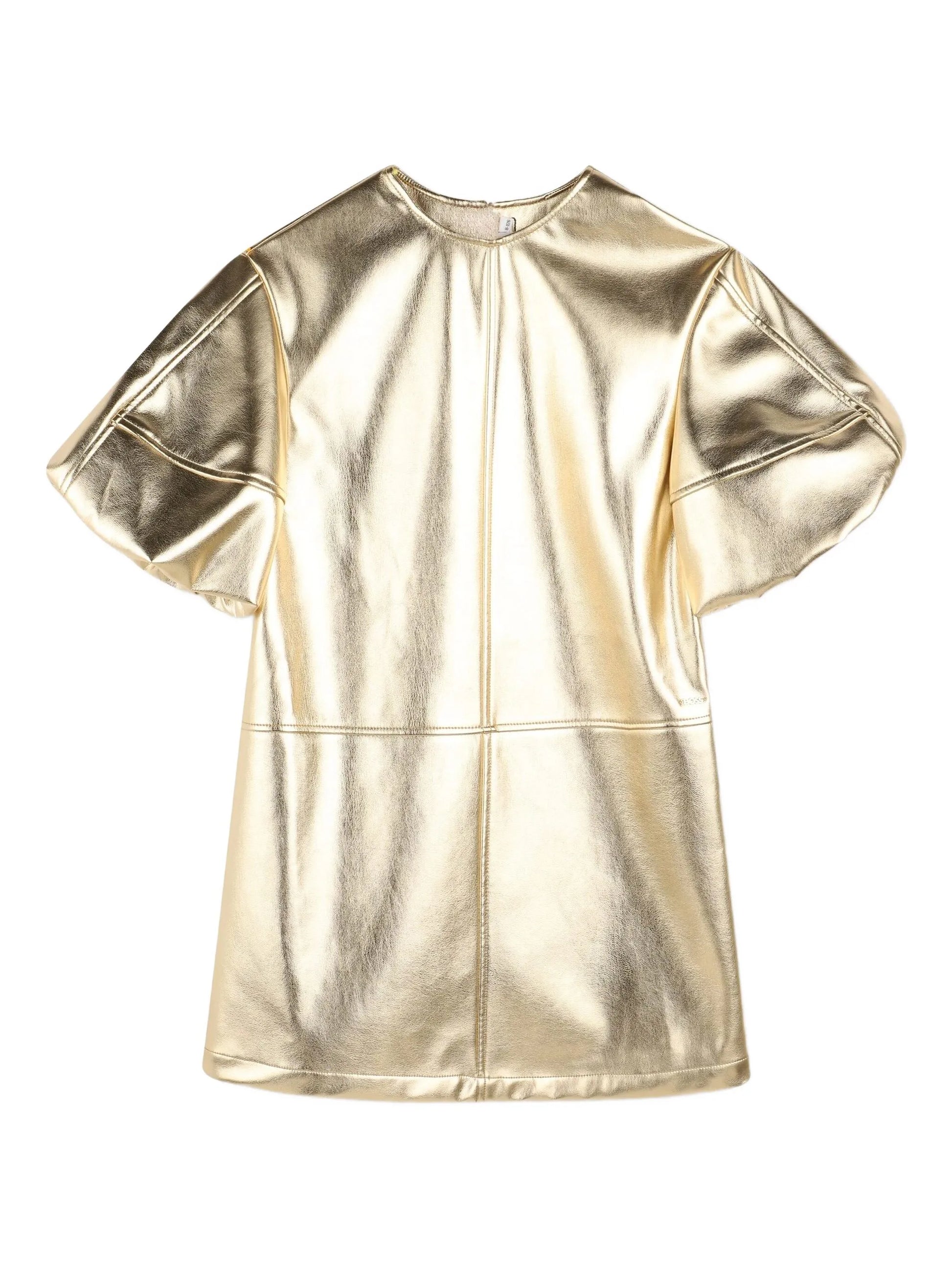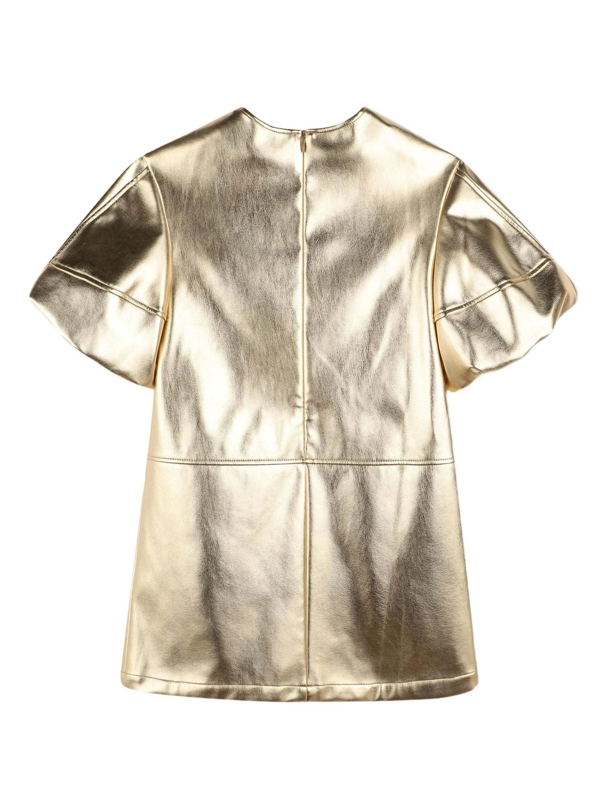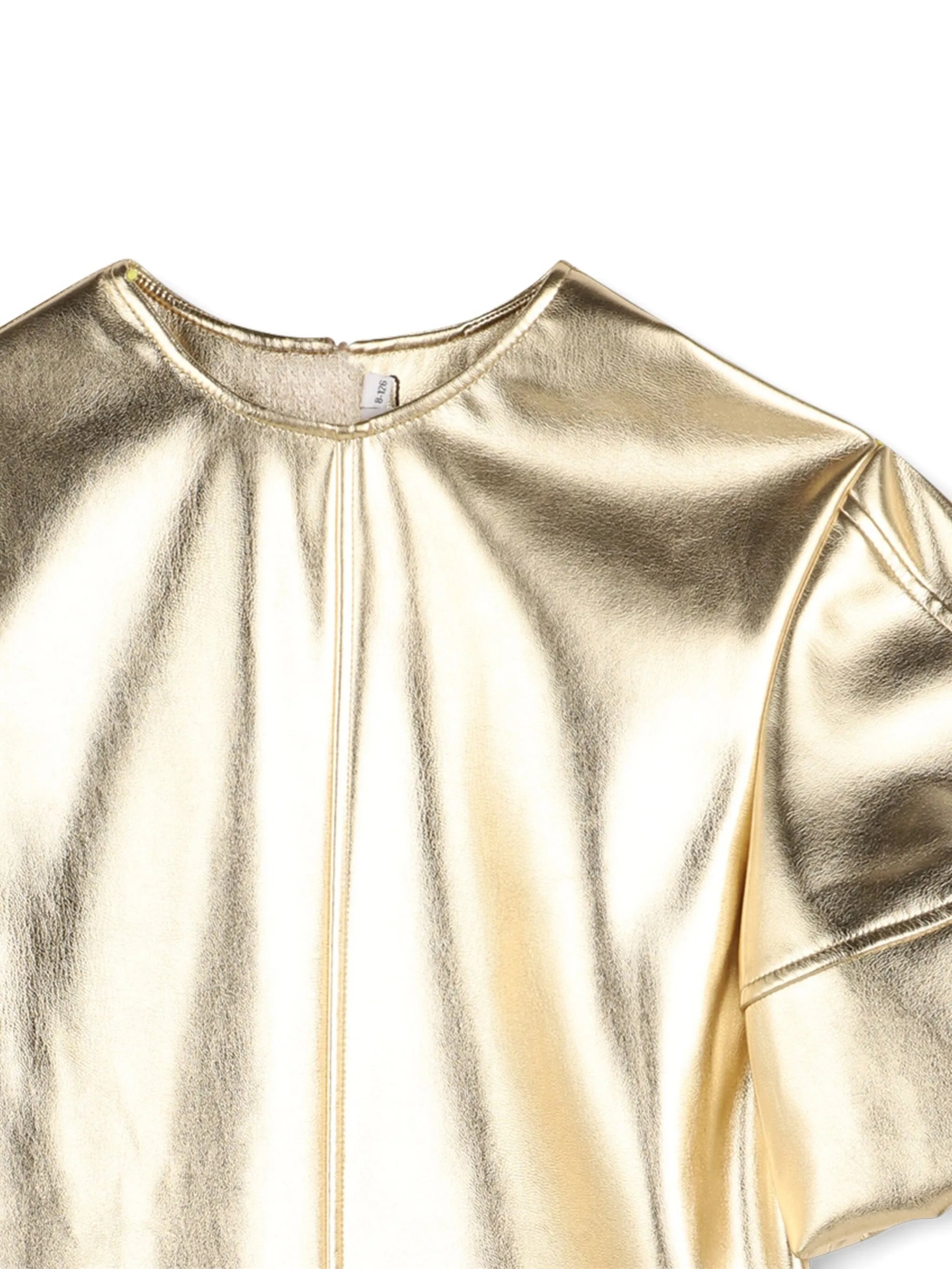 Златиста рокля с къс, бухнал ръкав, малко златисто лого.