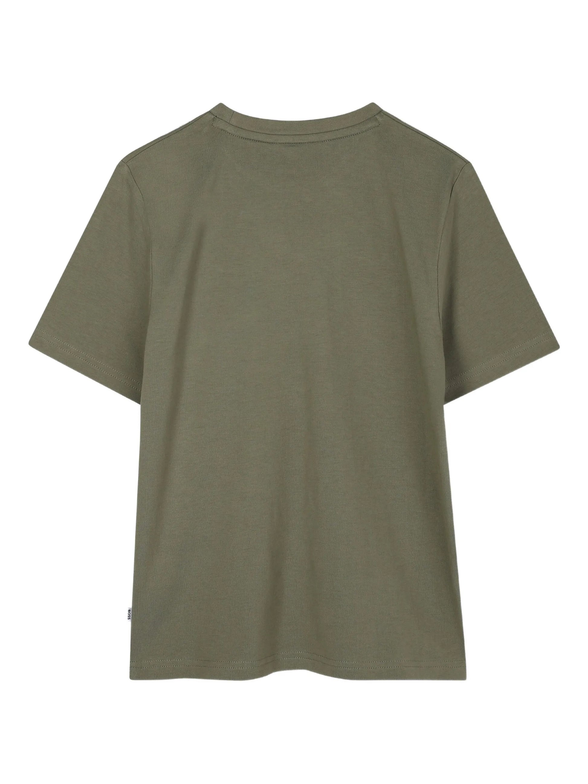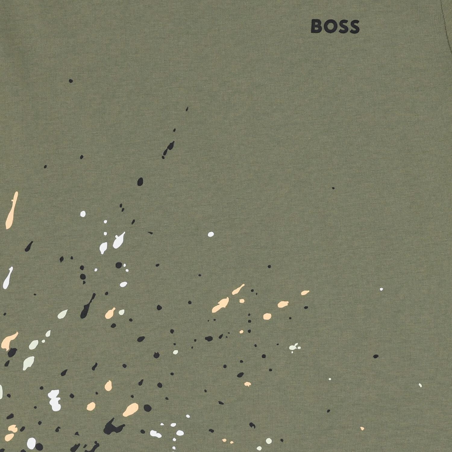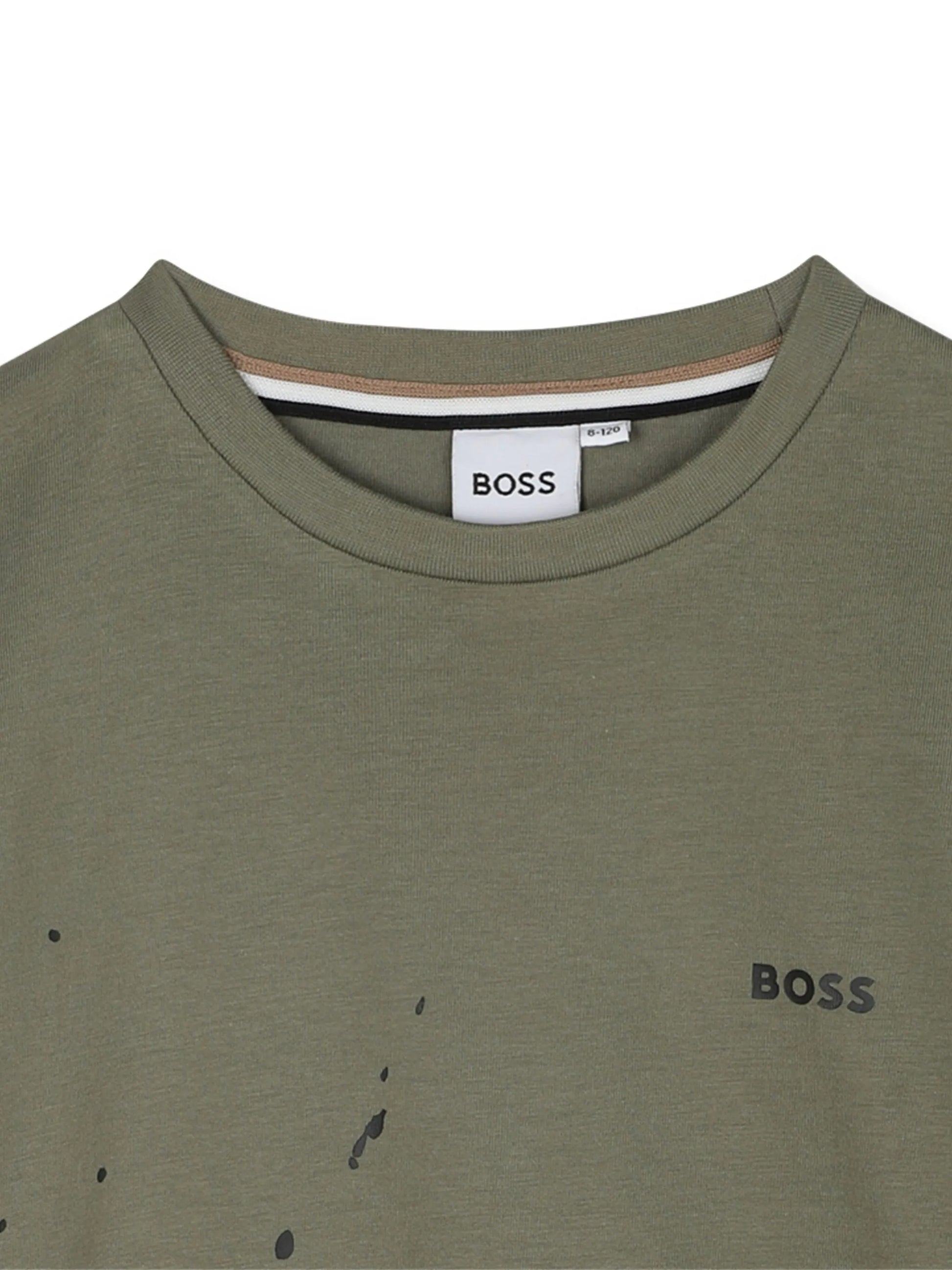 Зелена тениска, апликация с цветни пръски. Малко черно лого.
