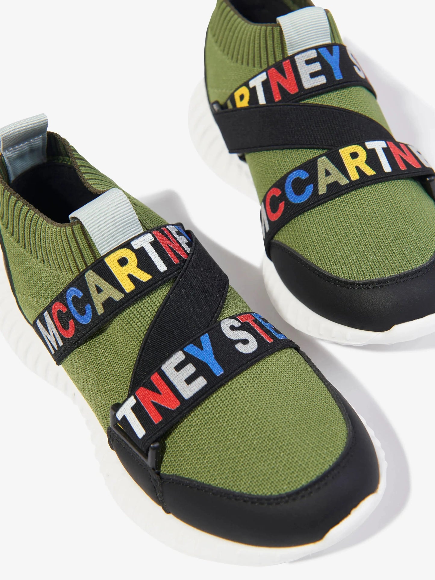 Зелени леки маратонки, тип чорап с черни ленти, контрастиращи цветни букви, лого.