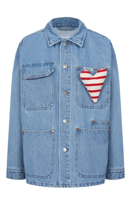 Синя деним риза-яке. Голямо щ, подвижмо сърце в червени-бяло райе.