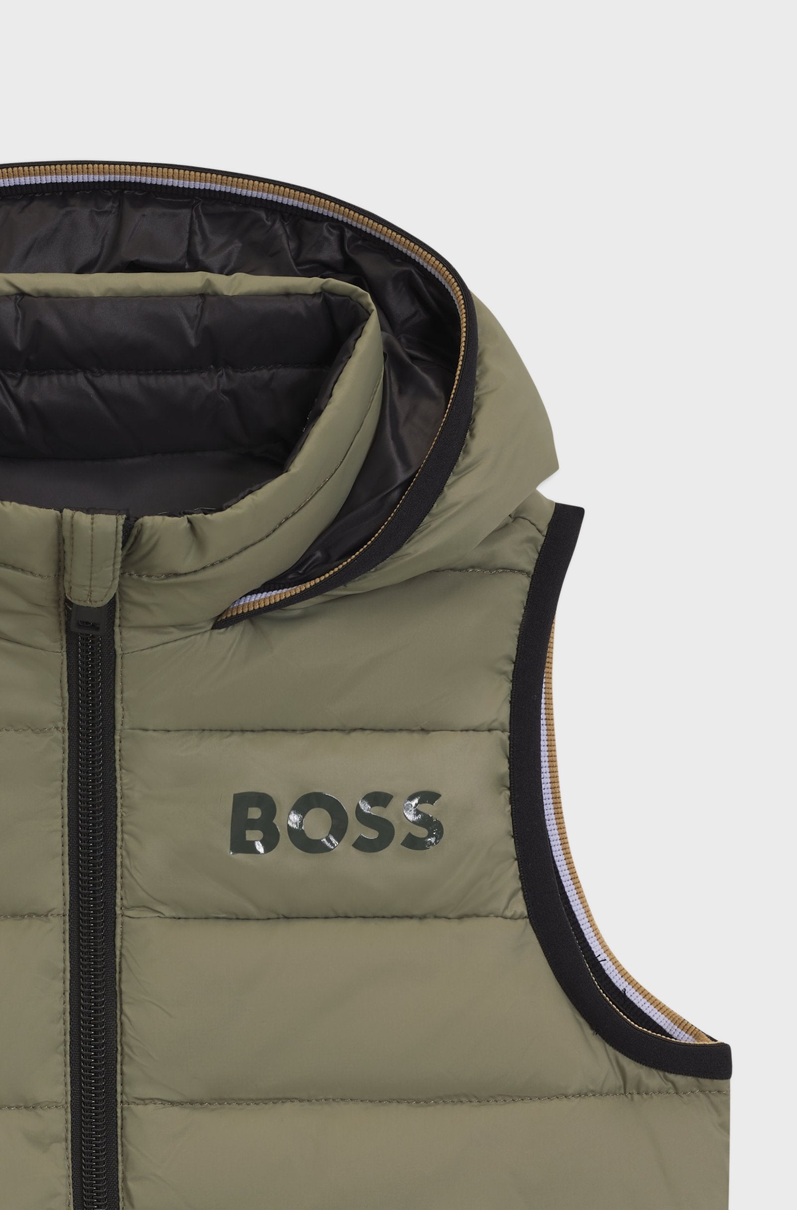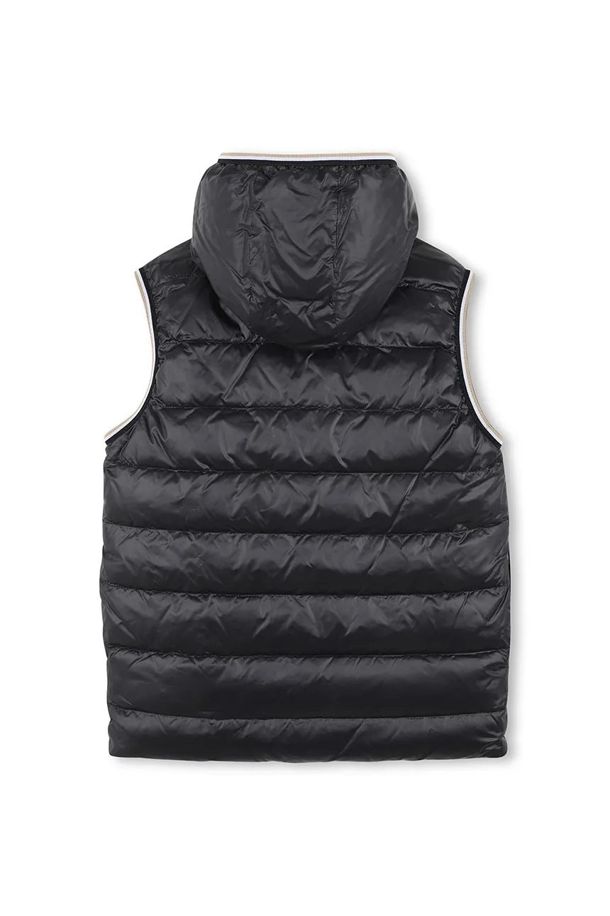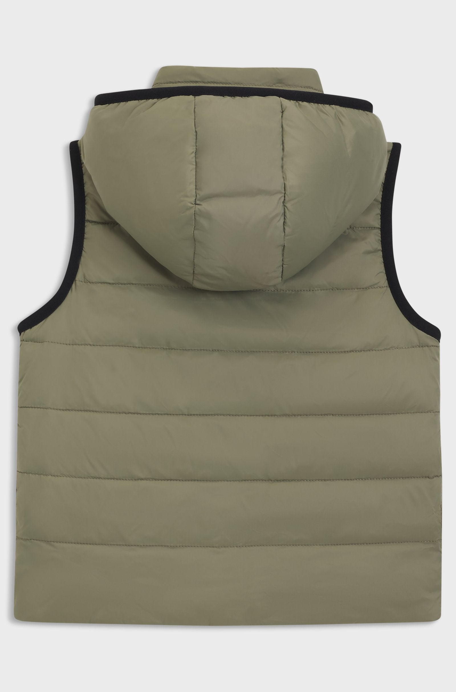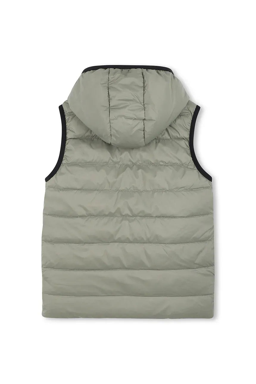 Пухен двулицев елек в зелено и черно, с качулка. Малко лого.