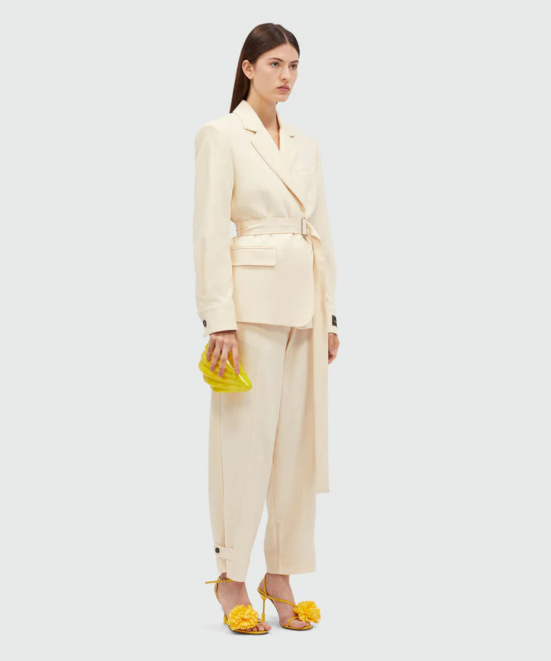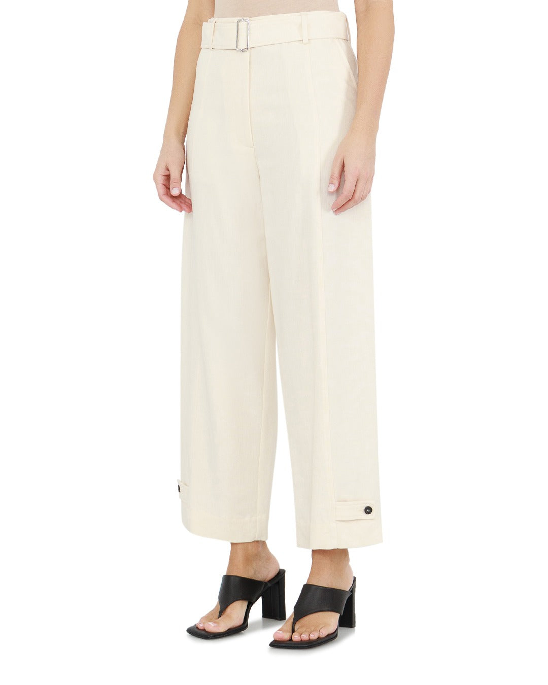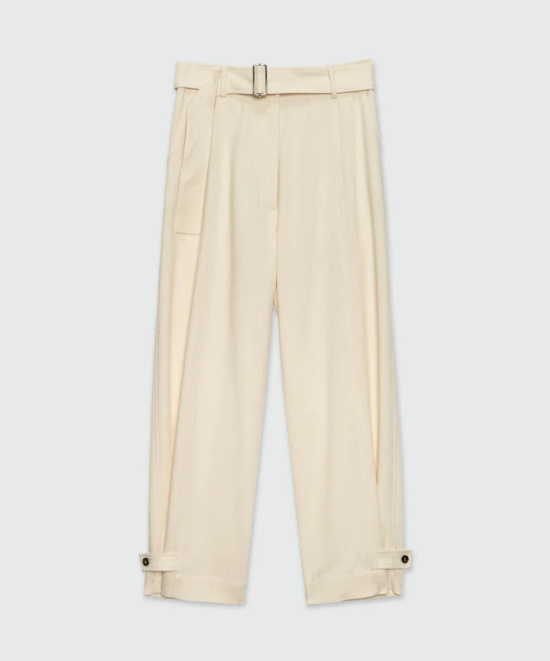 Панталон в цвят крема, със средновисока талия и колан. Странични джобове.