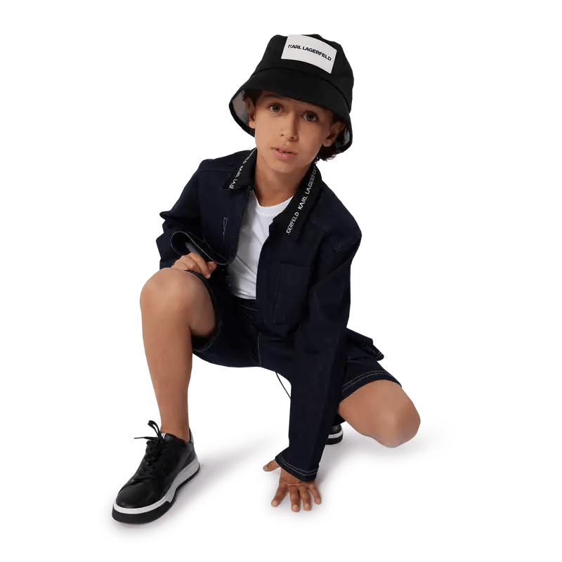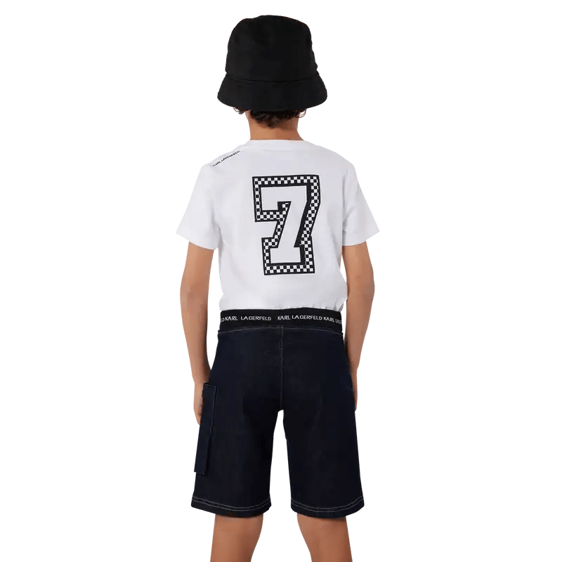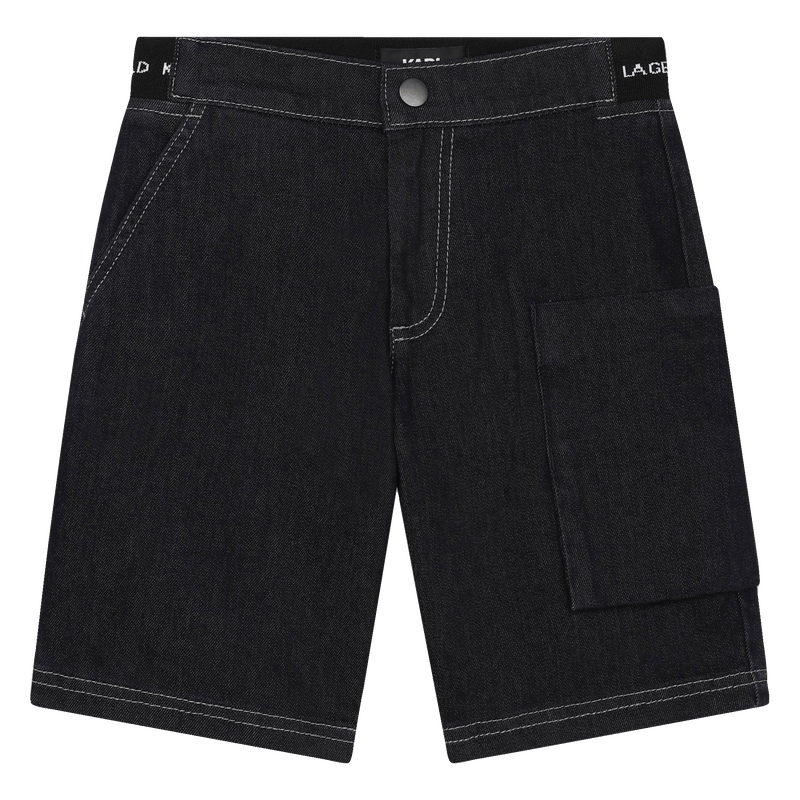 Тъмносини памучни къси панталонки, тип дънкови бермуди. Карго джоб от едната страна на крачола. Черна еластична лента на талията в задната част на модела, бели надписи, лого за допълнителен комфорт при движение.