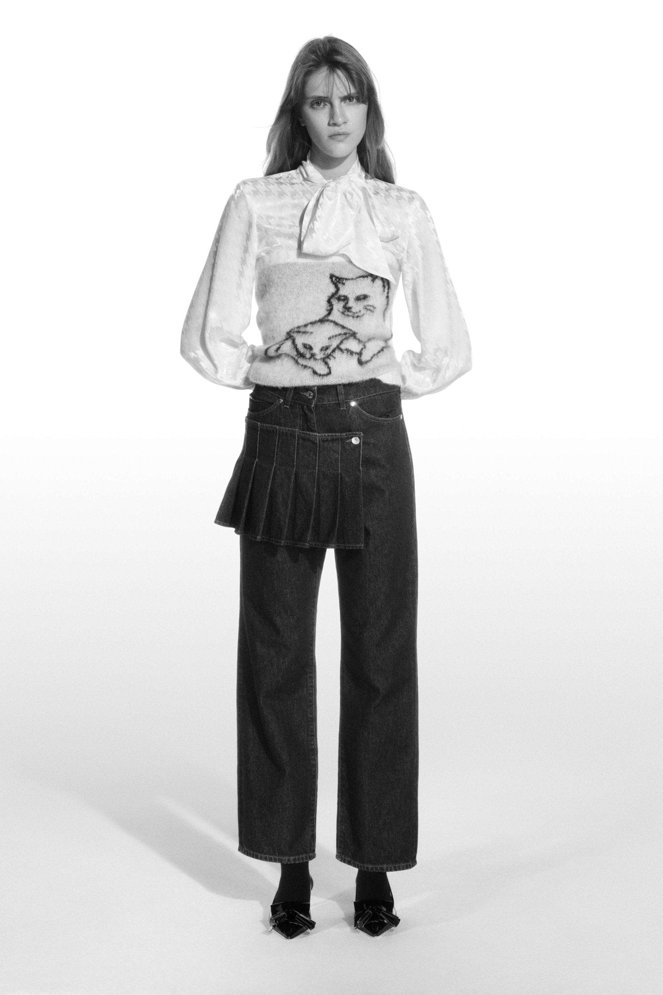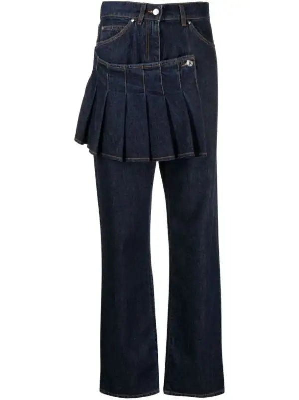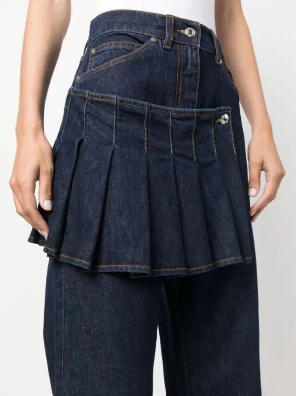 Сини индиго дънки с мини плисе пола като ефект “пола върху панталон”. Контрастиращи шевове в тютюнев цвят. Прав модел, леко широки крачоли. Гайки на талията за възможност на носене с колан..