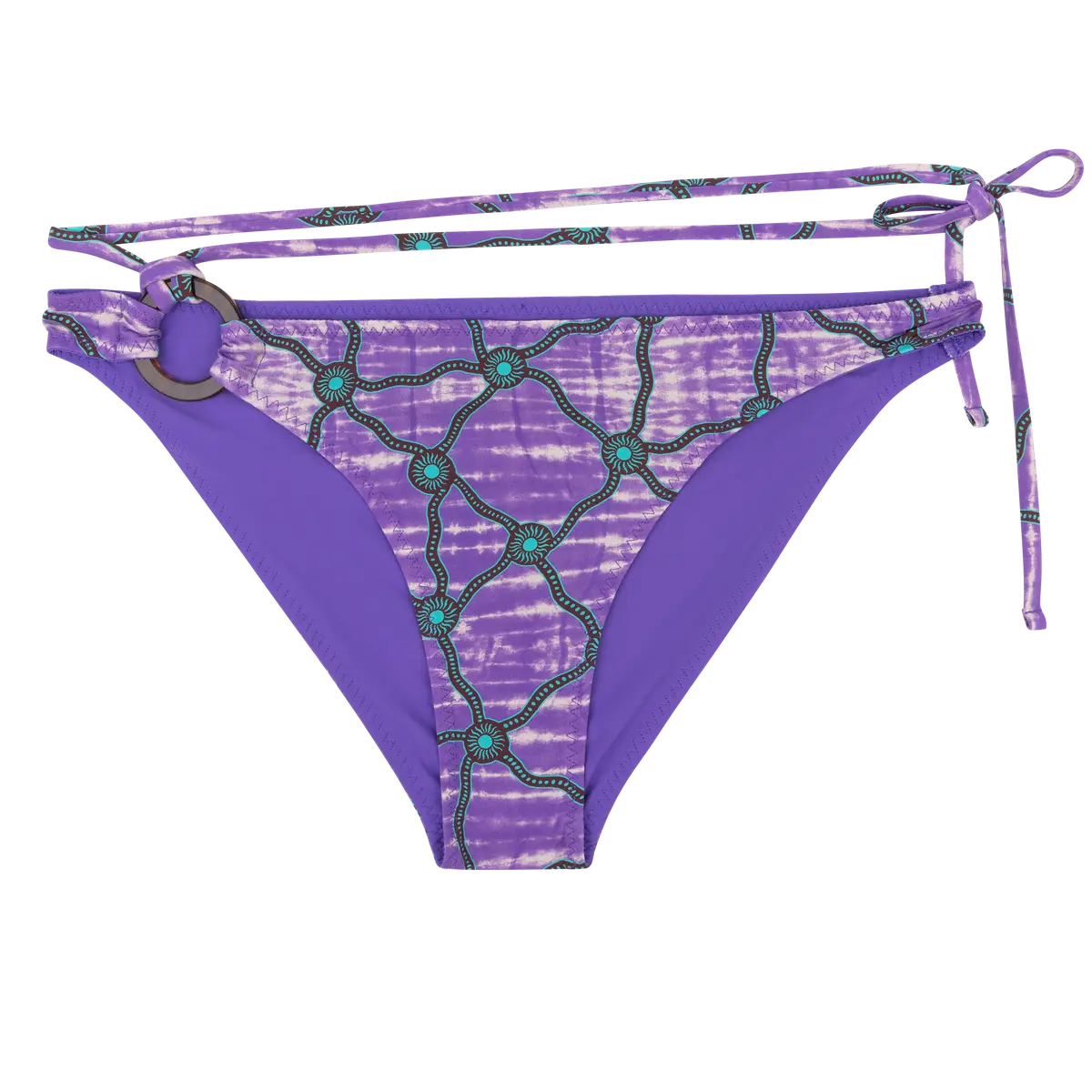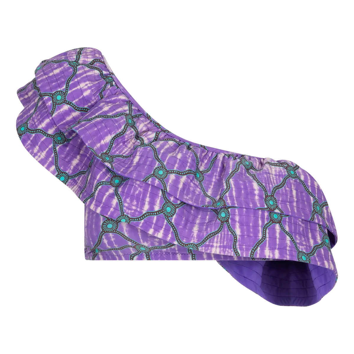 Лилав бански с принт от зелени фигури. Горна част с едно рамо и харбали. Долна част с връзка.