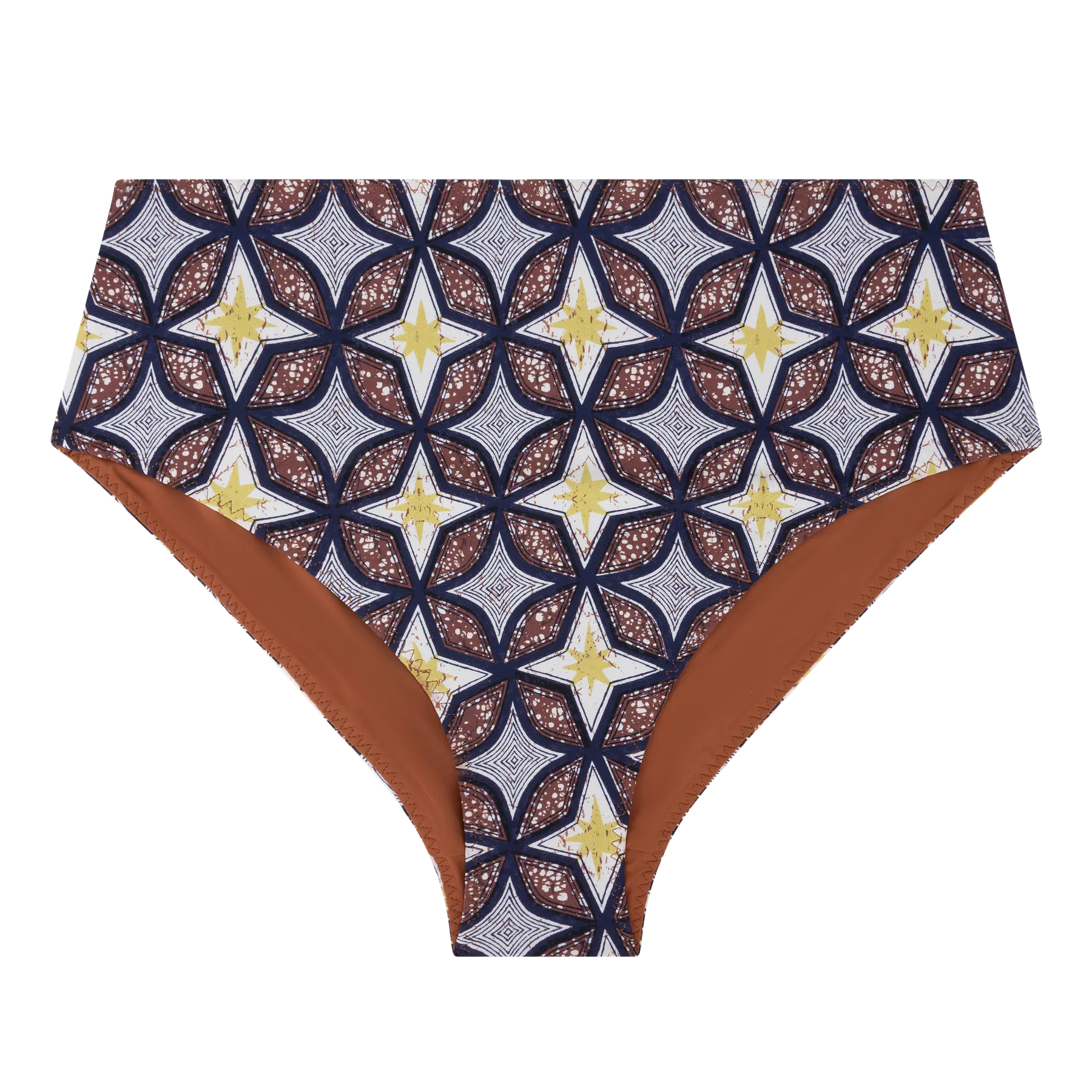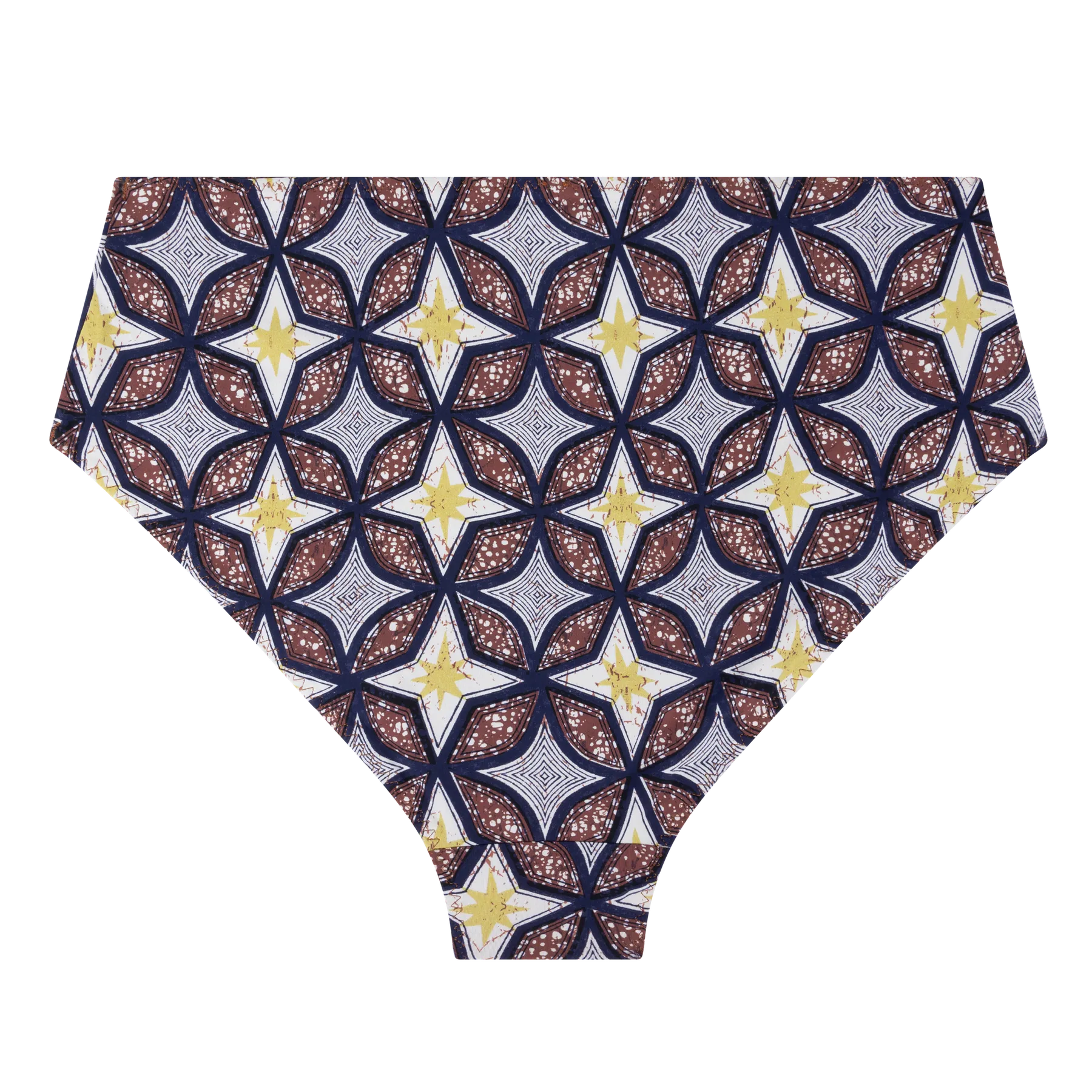 Тъмносин бански с принт от фигури. Горна част с едно рамо, долнище с висока талия.
