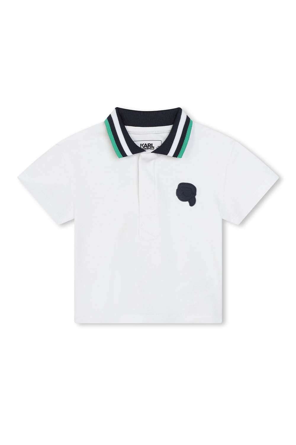 Комплект от две части. Тъмносини къси панталонки, малка бяла емблема, лого. Еластична лента на талията за допълнителен комфорт при движение. Диагонални джобове. Бяла тениска, цветна якичка с копчета около деколтето. Ефектна апликация на гърба, Карлито със зелена шапка за тенис.