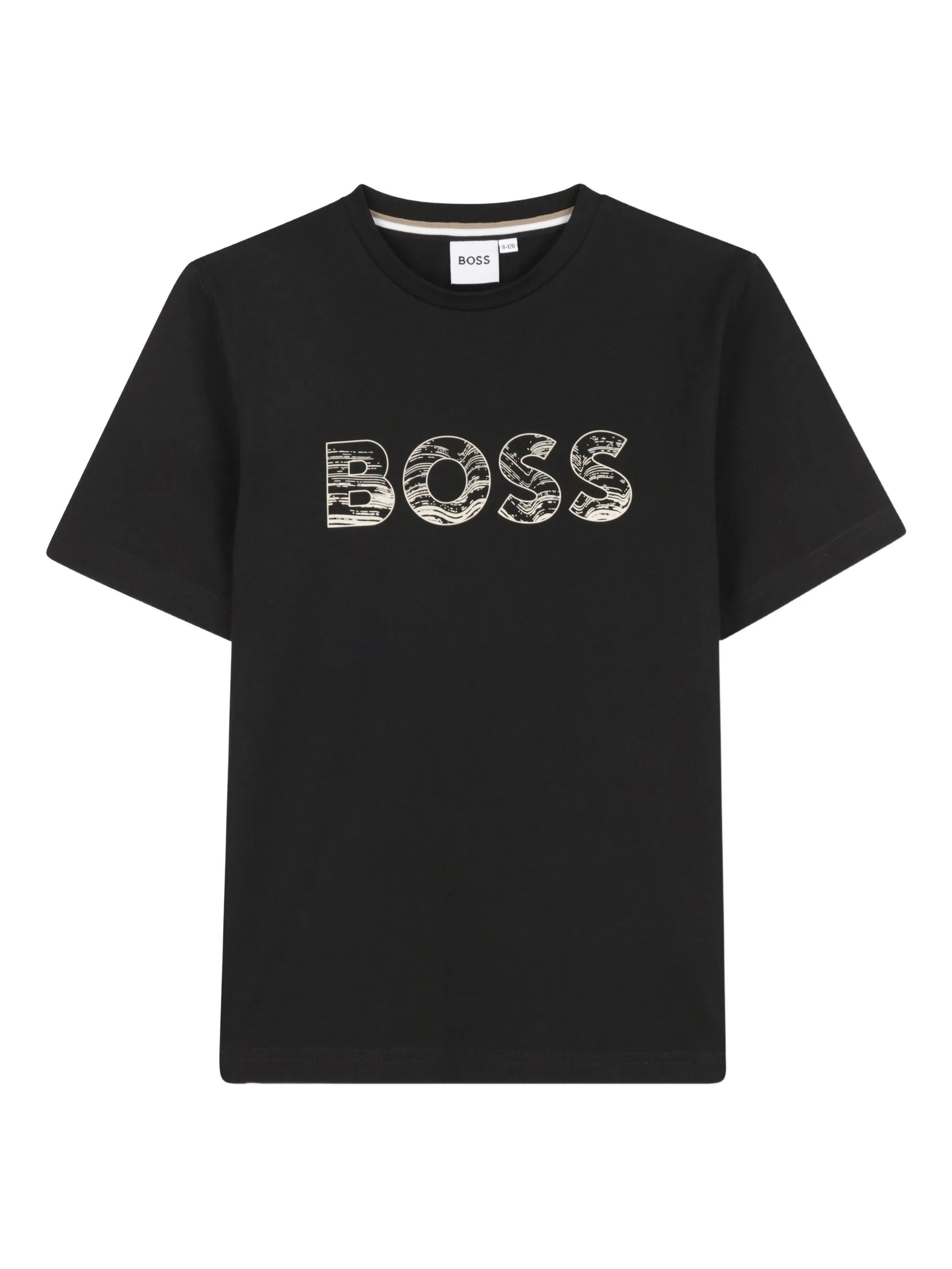 Черна тениска, релефно лого в бежово.