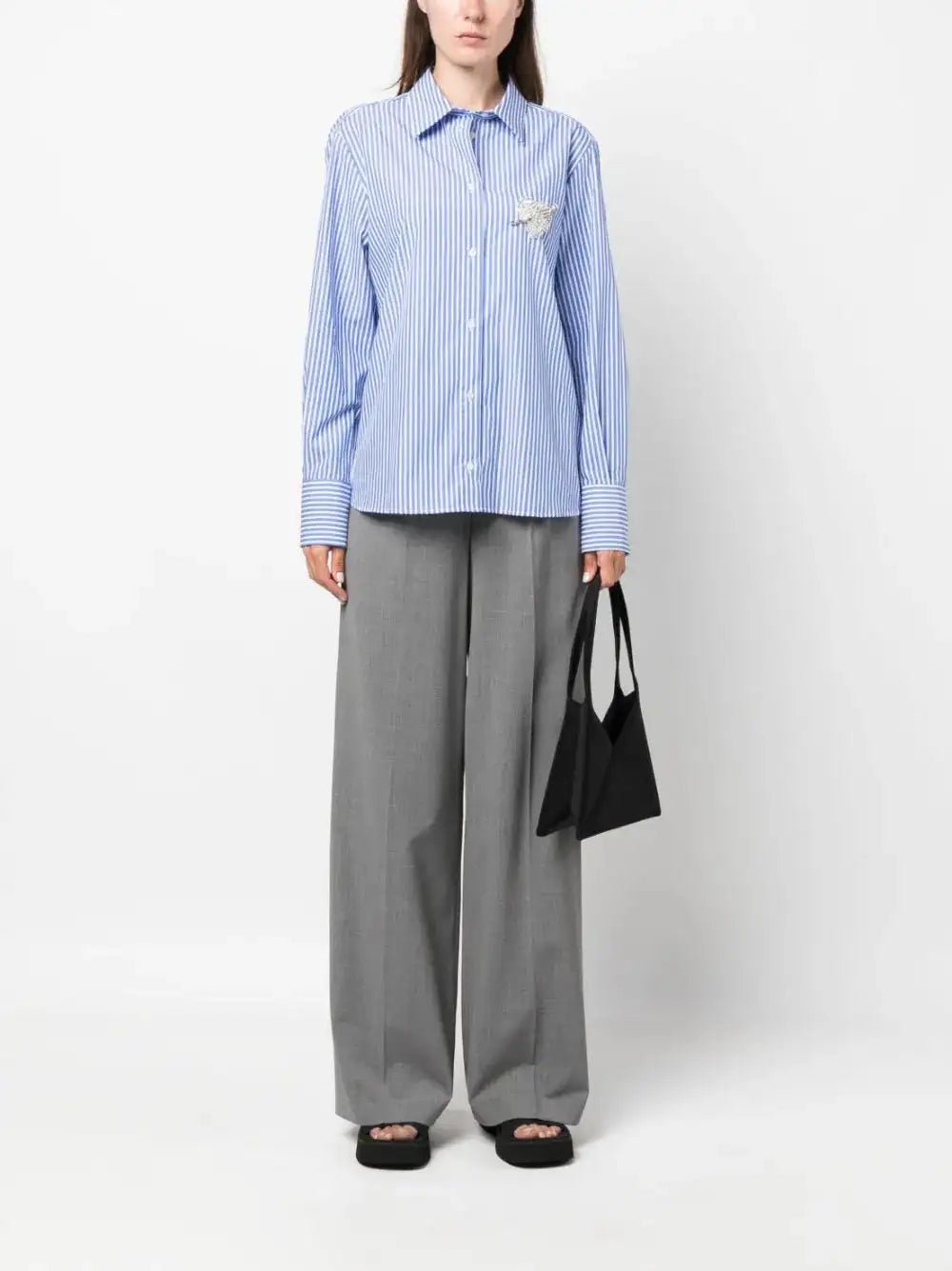Сив свободен панталон. Прав модел, с ръб. Черен, еластичен ластик на талията с лого.