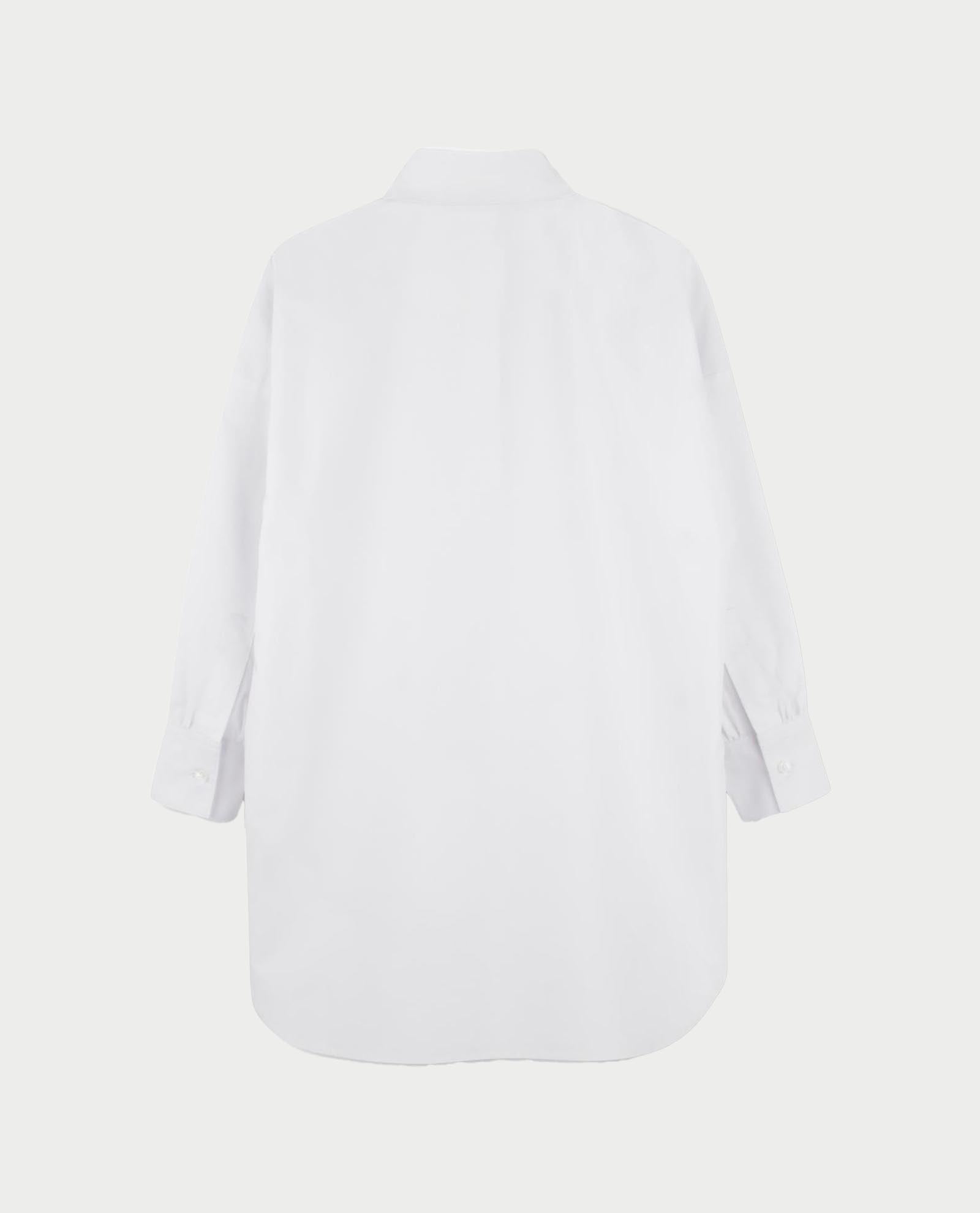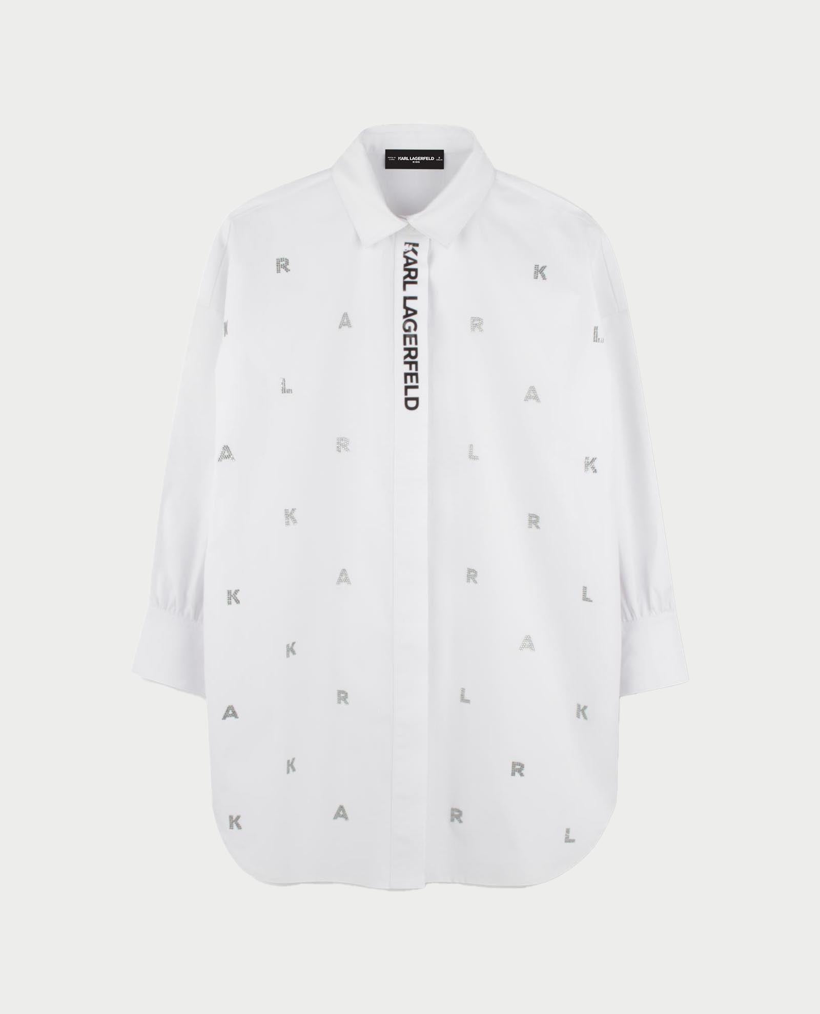 Бяла риза, тип рокля. Принт от букви с камъни по целия модел. Черно лого.