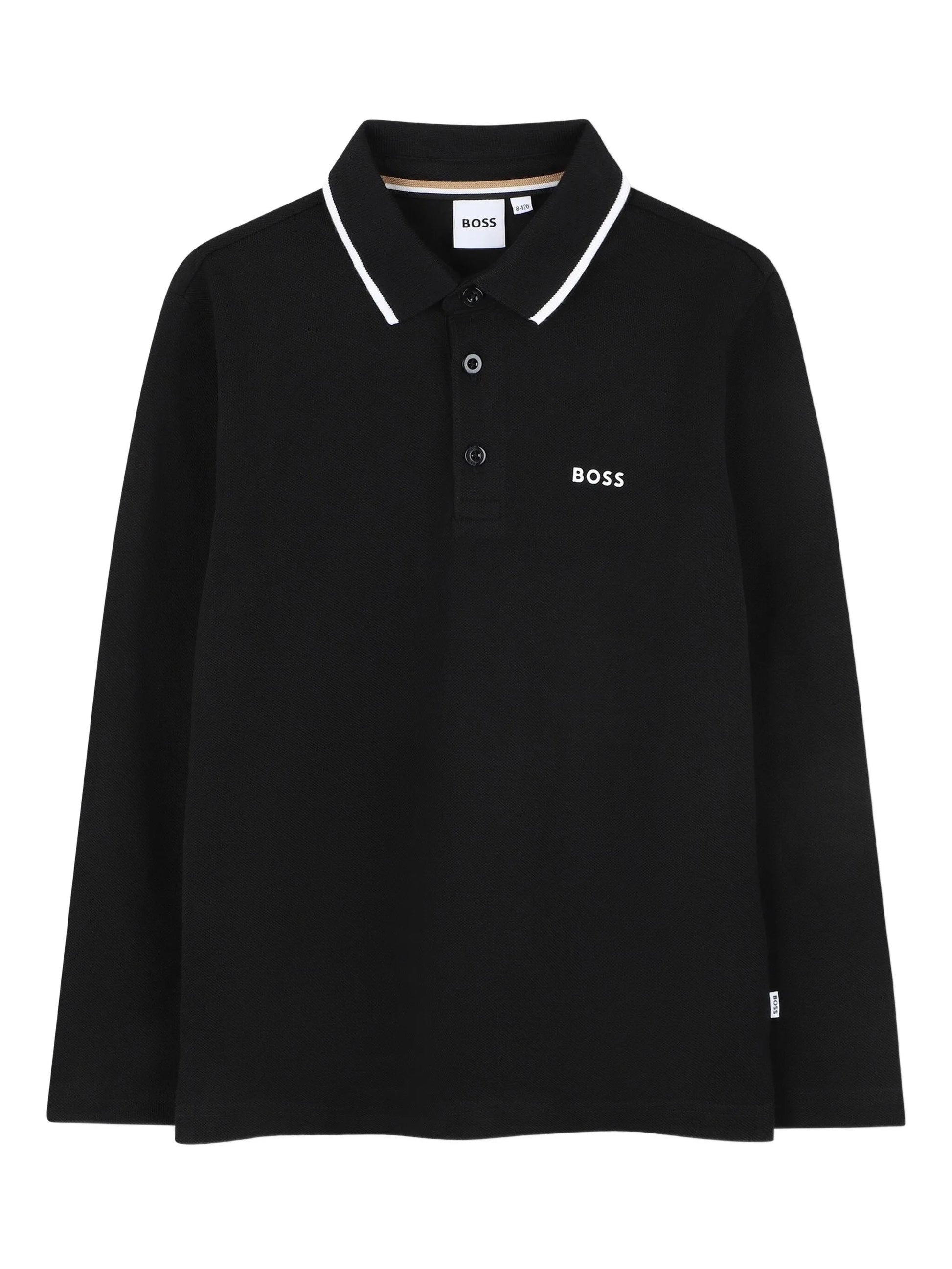 Черна блуза с дълъг ръкав. Яка с контрастиращи бели ленти. Малко бяло лого.