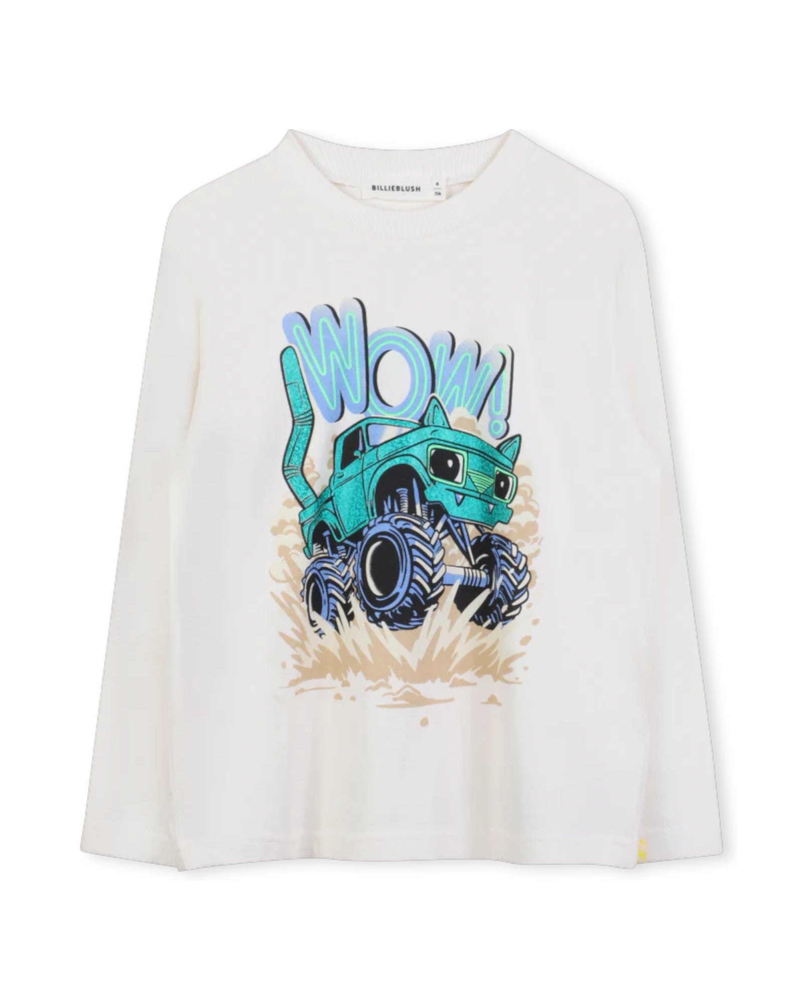 Бяла блуза с дълъг ръкав, цветна апликация с кола и надписи.