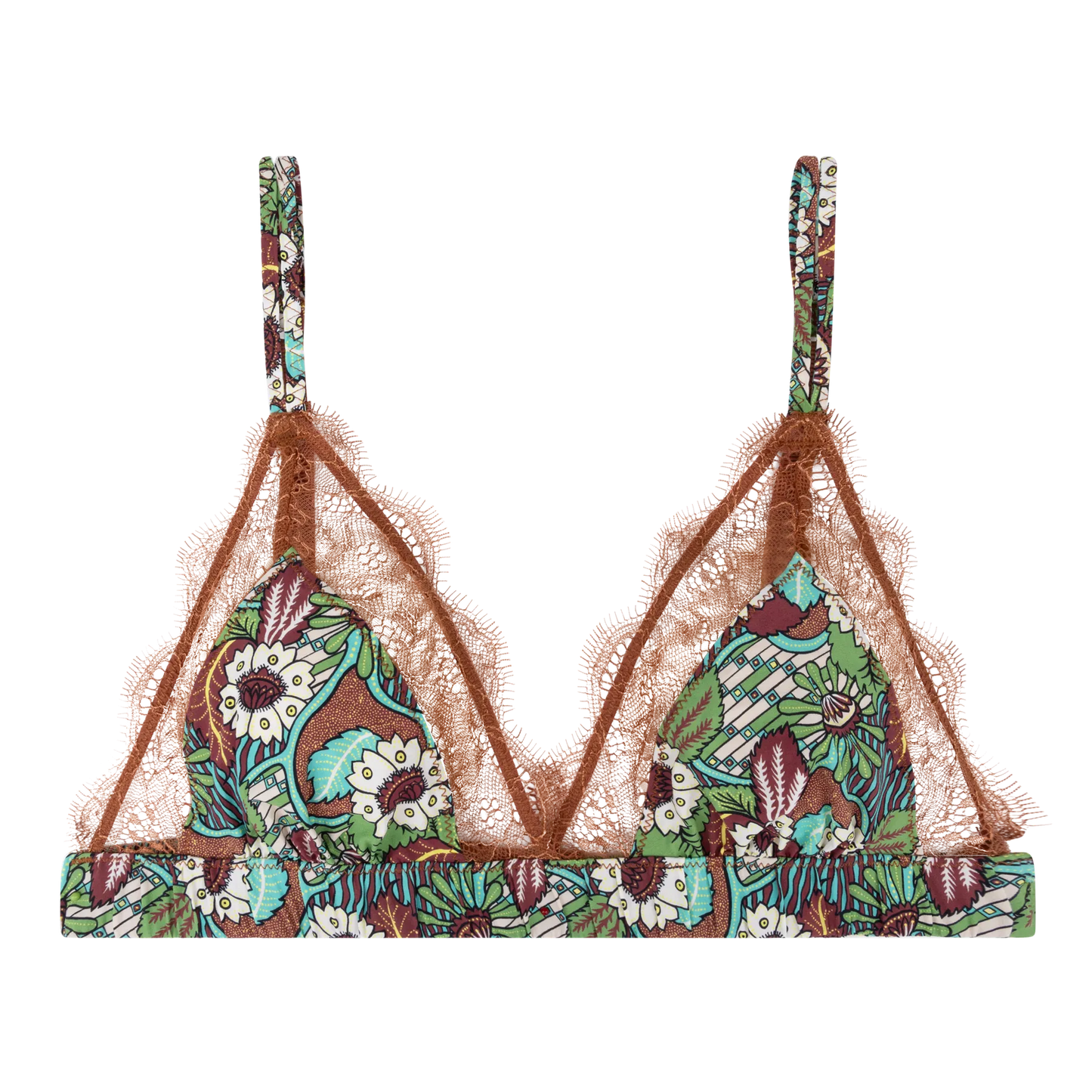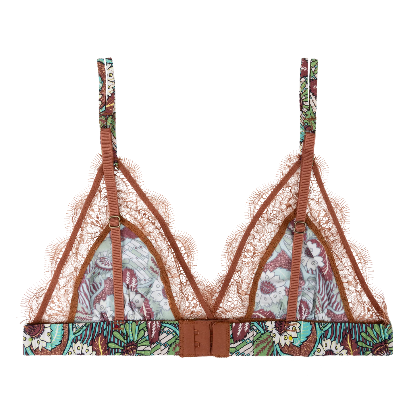 Зелен сутиен с меки триъгълни чашки и флорален принт. Кафява дантела.