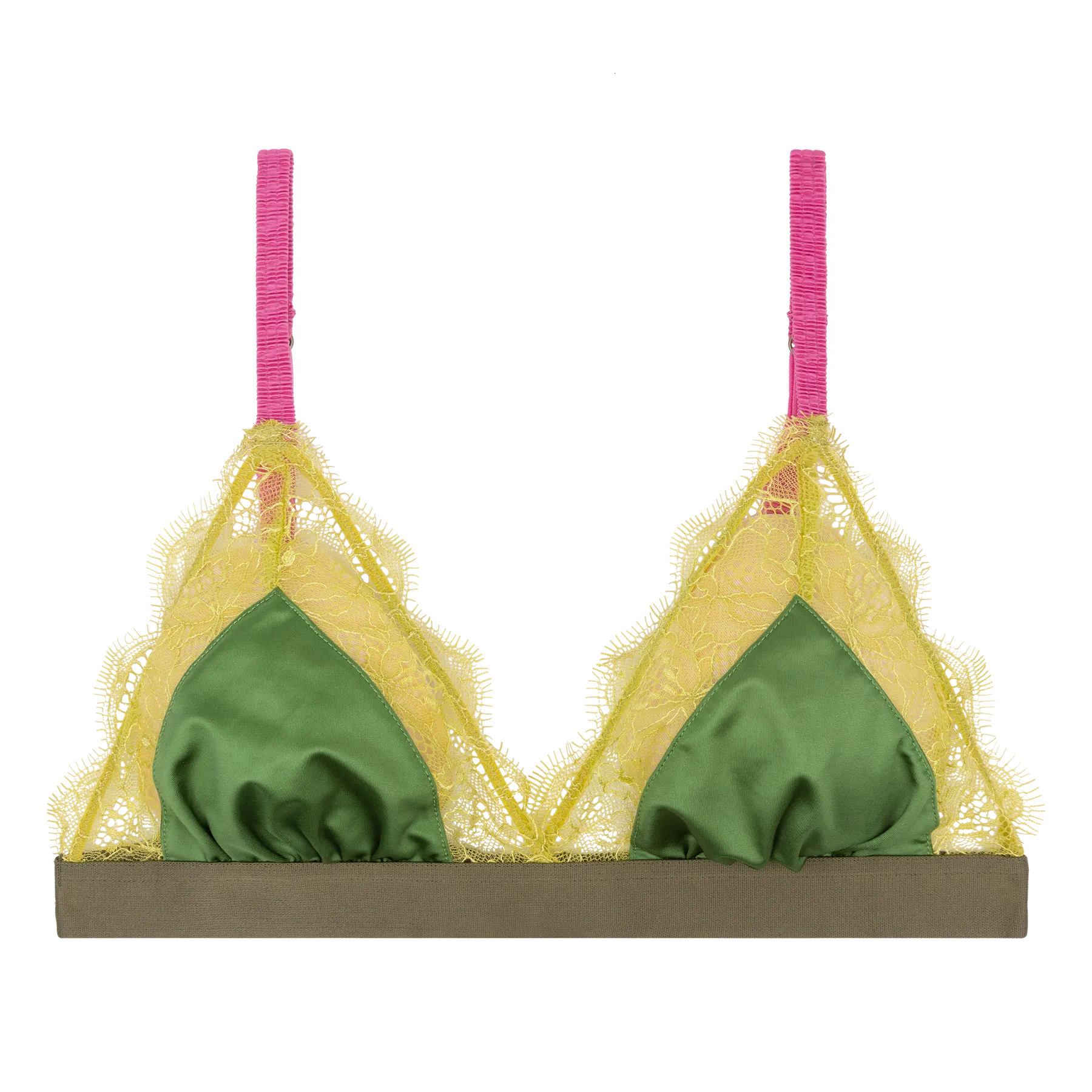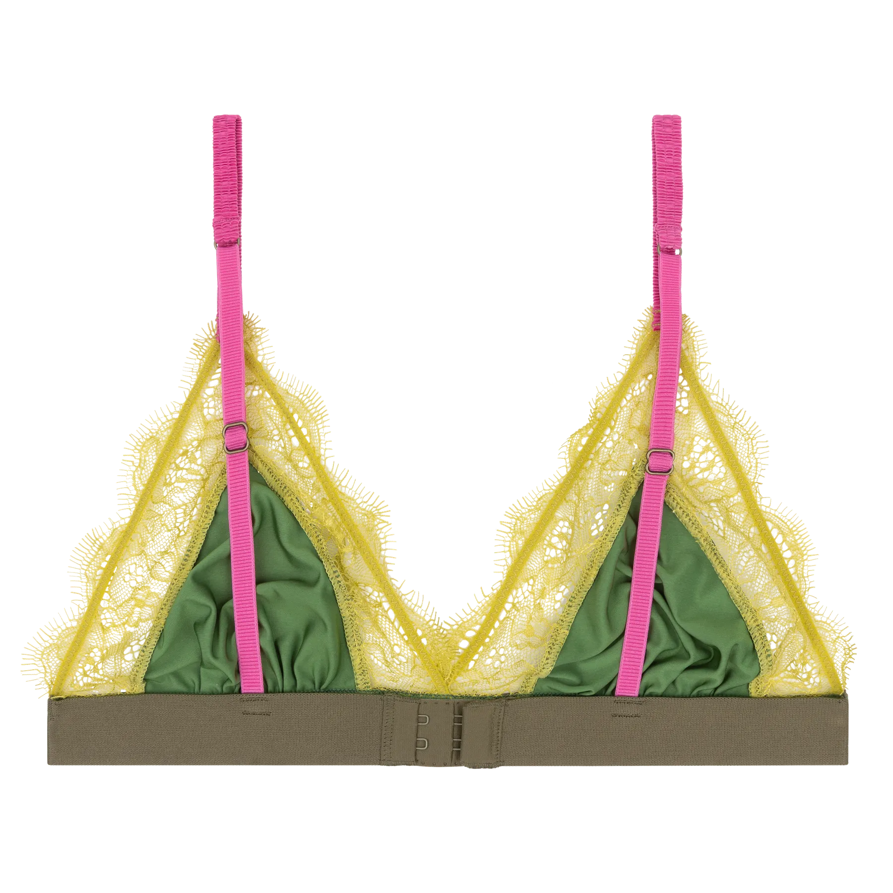 Зелен сутиен с меки триъгълни чашки. Нежна жълта дантела. Розови регулируеми презрамки и еластична лента под бюста за допълнителен комфорт.