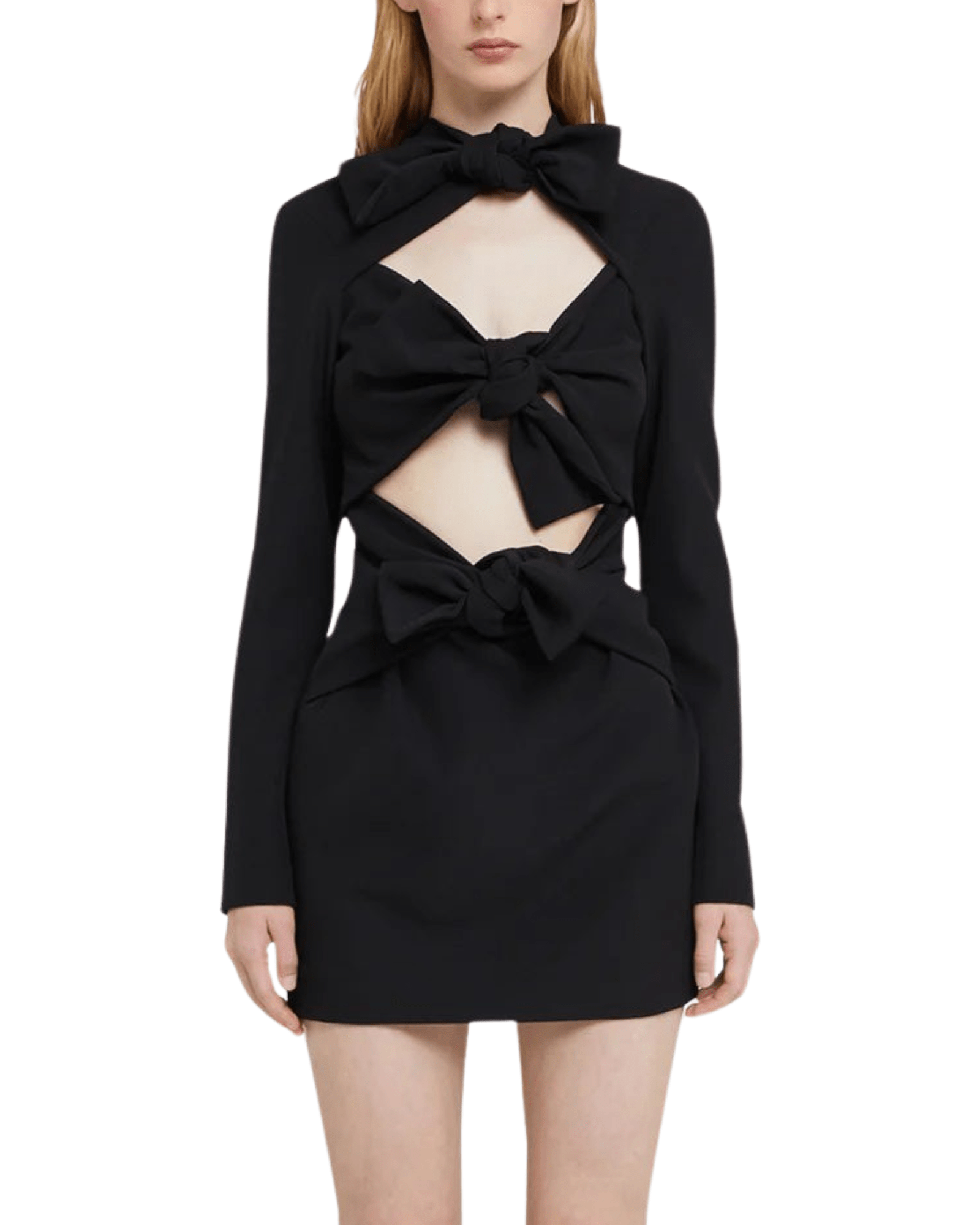Черна къса рокля с дълъг ръкав. Ефирен детайл от панделки отпред. Дължина над коляното.