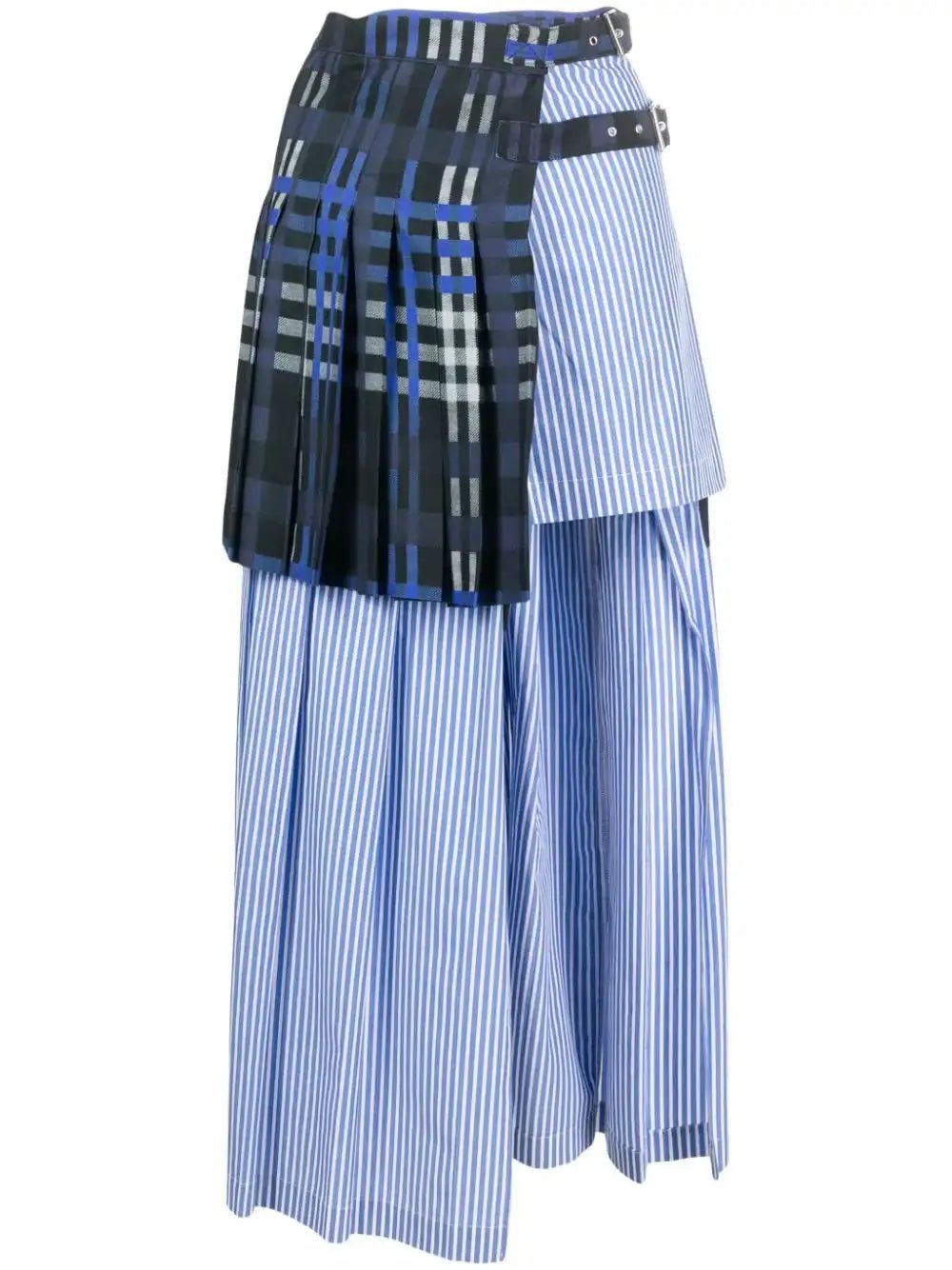 Асиметрична пола в бяло синьо-райе. Мини каре платка в горна на модела с коланчета на талията. Полата създава излюзия за къса върху дъкга пола.