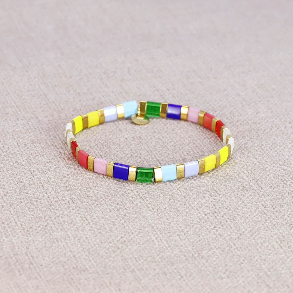 Еластична гривна от плоски цветни мъниста миюки.