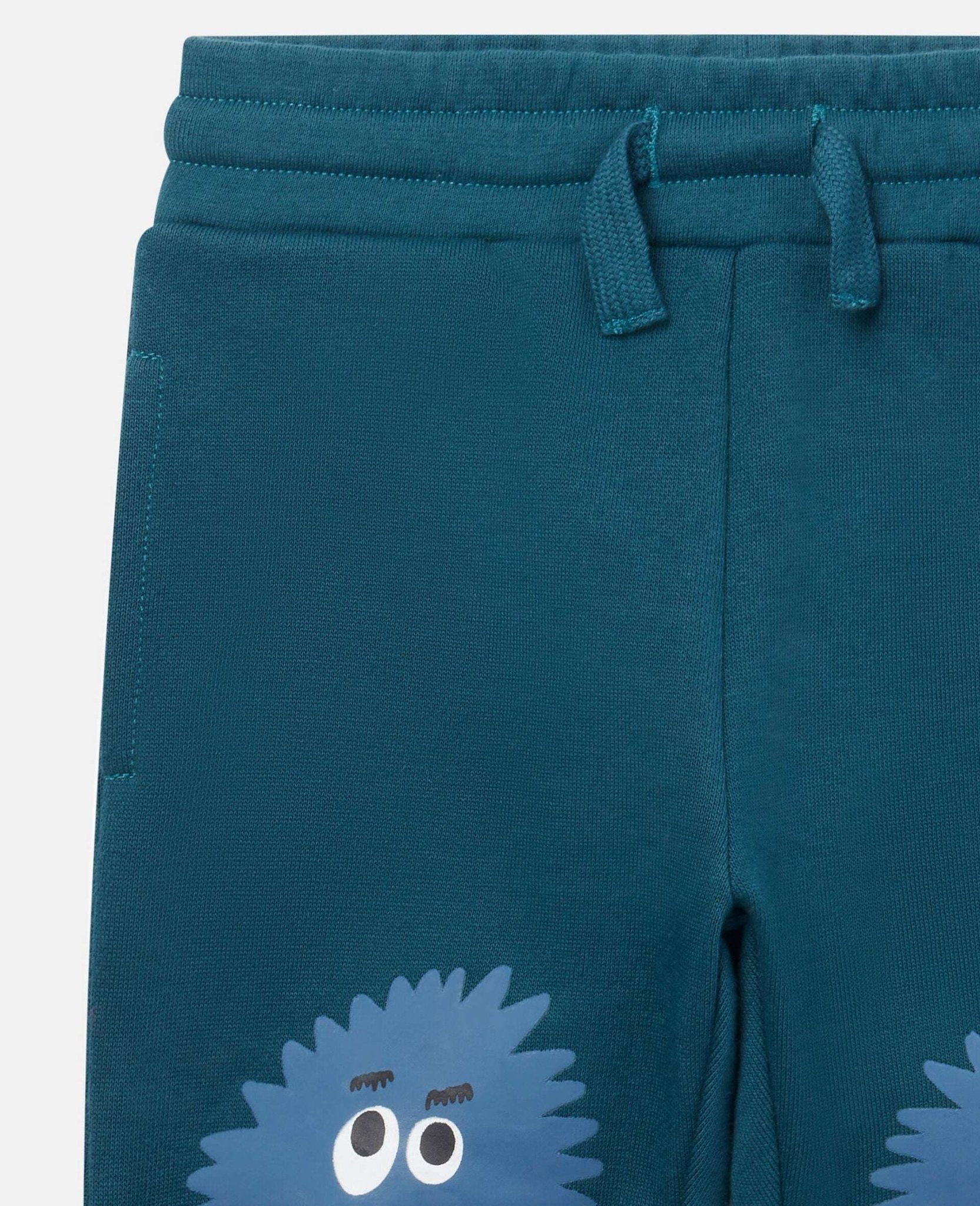 Синьо-зелено долнище с еластичен ластик на талията и връзки за допълнителен комфорт при движение. Малка апликация на коленете от сини човечета, ефирни ципове. Диагонални джобове.