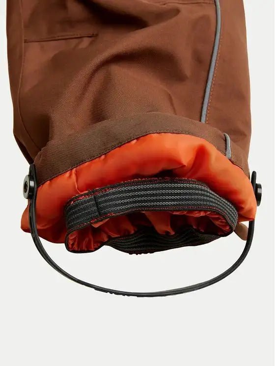 Кафяв ски панталон с емблема на панда и бели тиранти.
