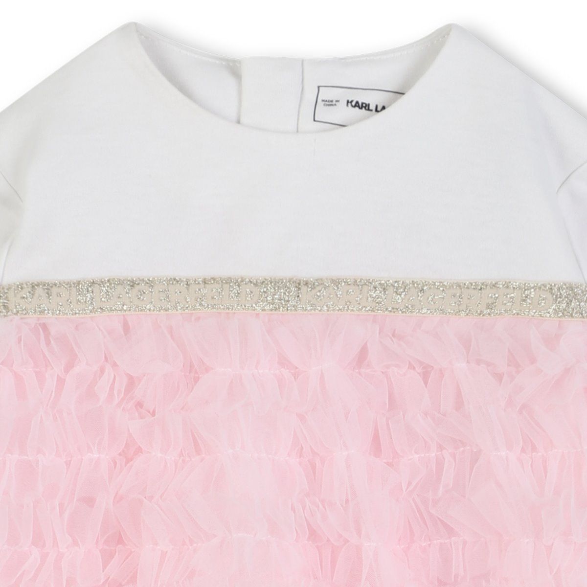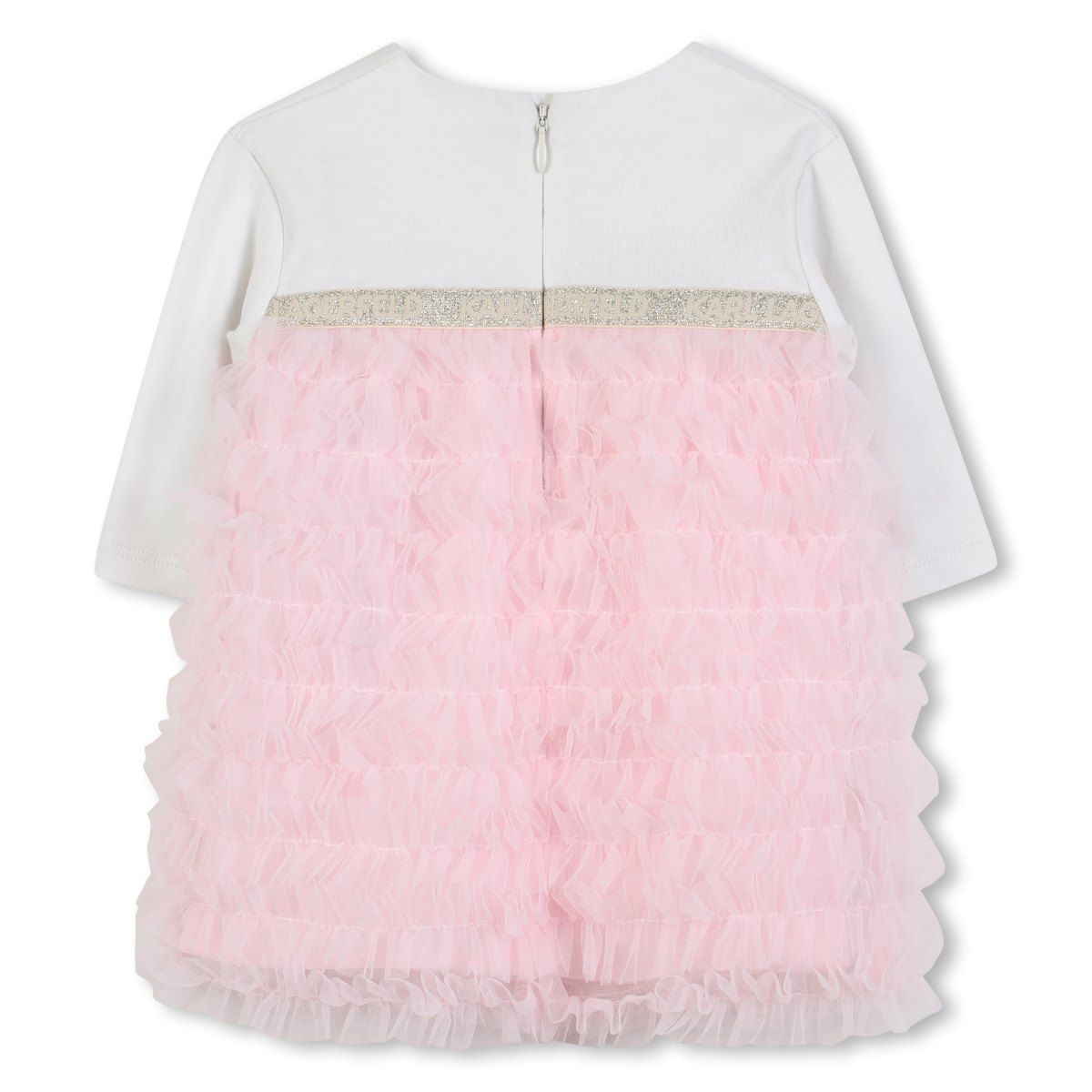 Бяла рокля с дълъг ръкав, розови тюлени волани. Златисто коланче с лого.