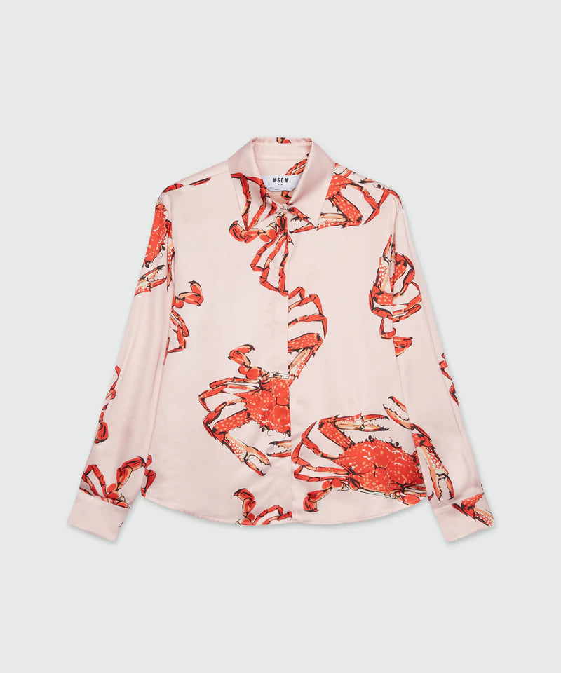 Риза в розов цвят, от лек вискозен сатен. Принт от червени раци.