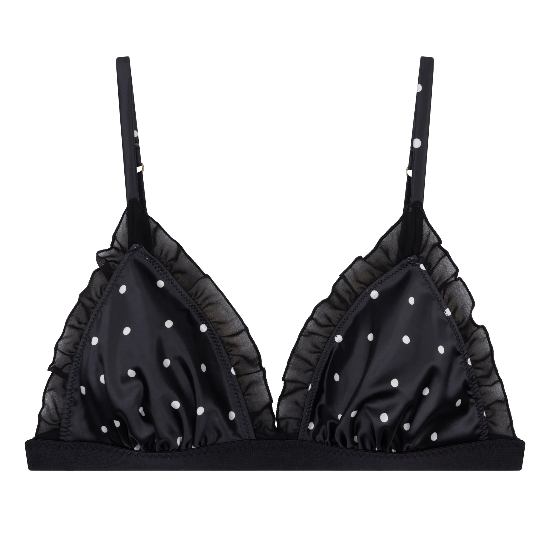 Черен сатенен сутиен с харбалички, принт от бели точки. Мека чашка.