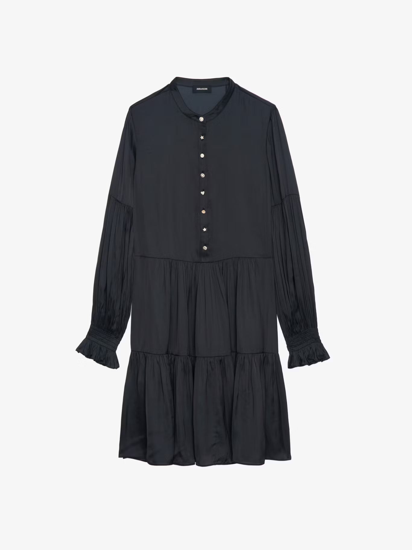Черна сатенена свободна рокля, дълги ръкави с волани. Блестящи копчета.