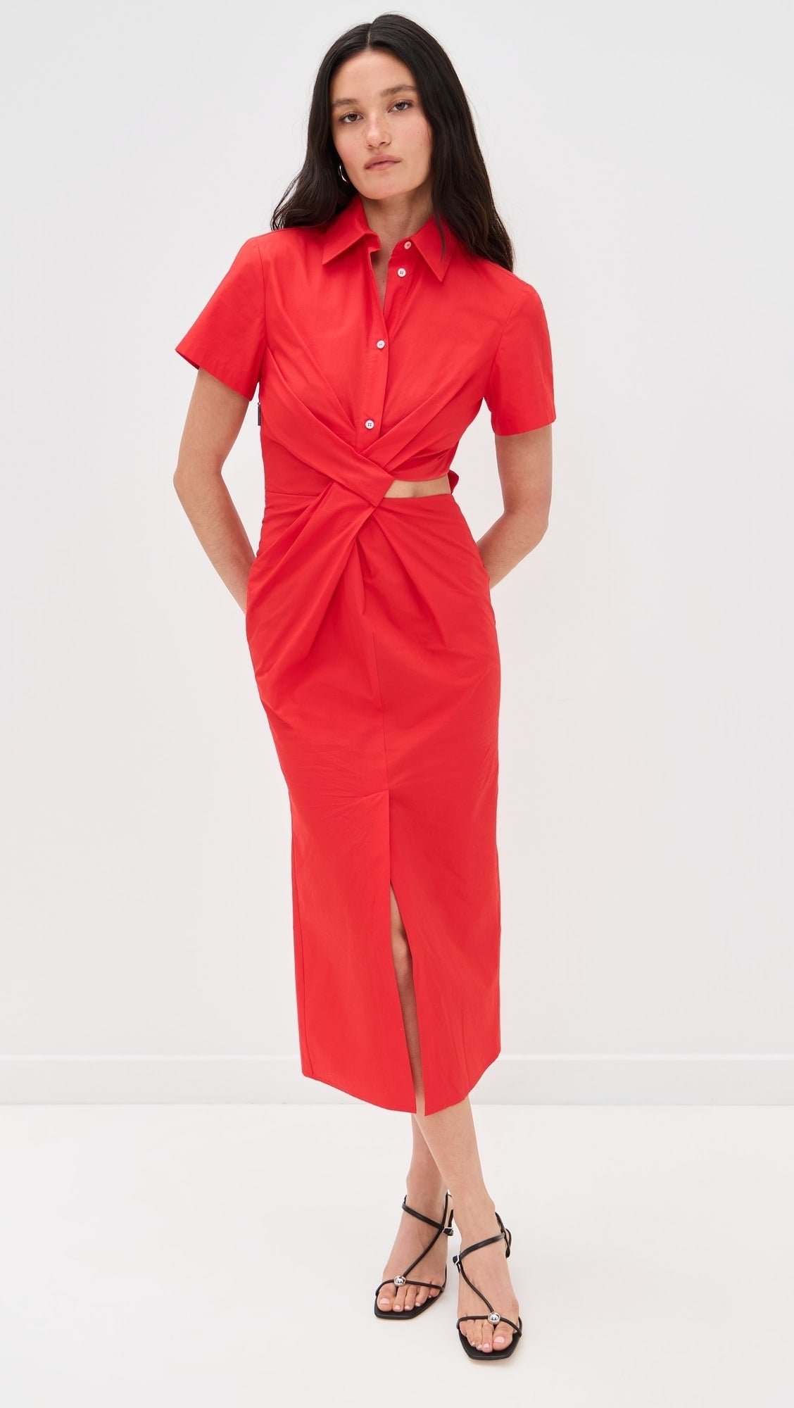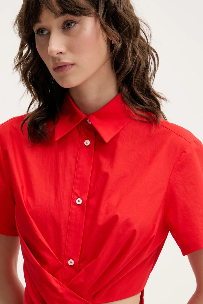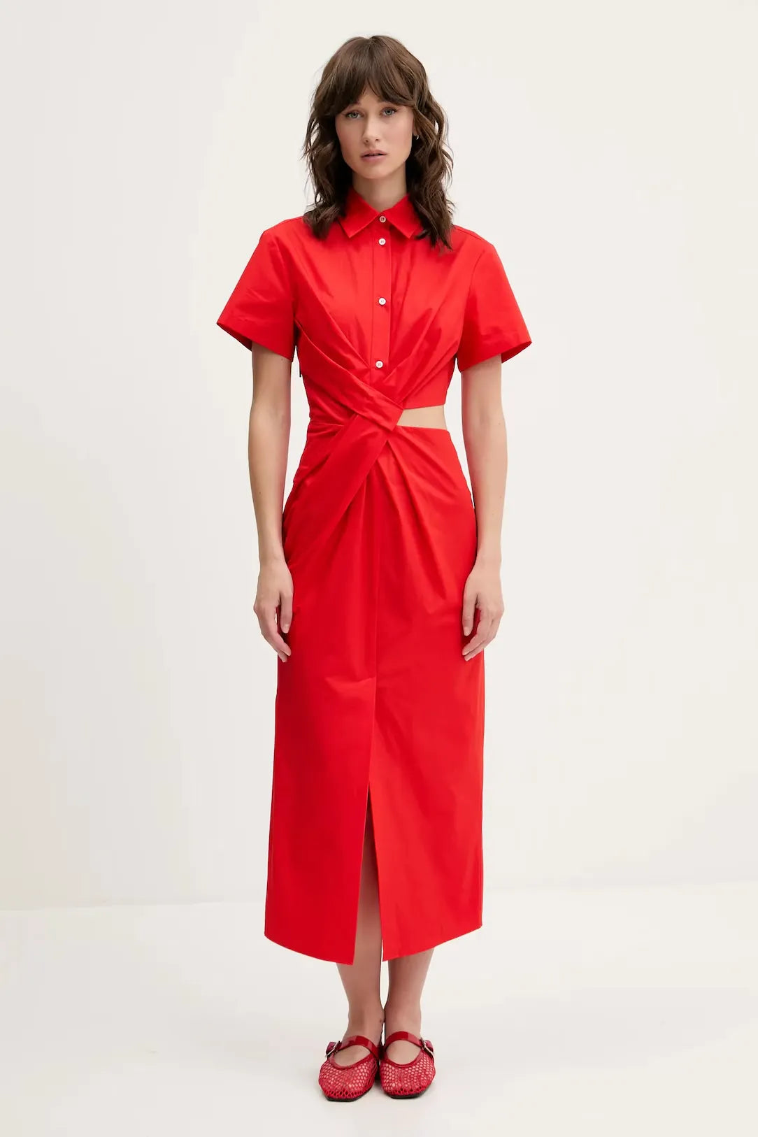 Червена миди рокля, тип риза. Отвор и набор на талията. Цепка отпред до средата на бедрото.