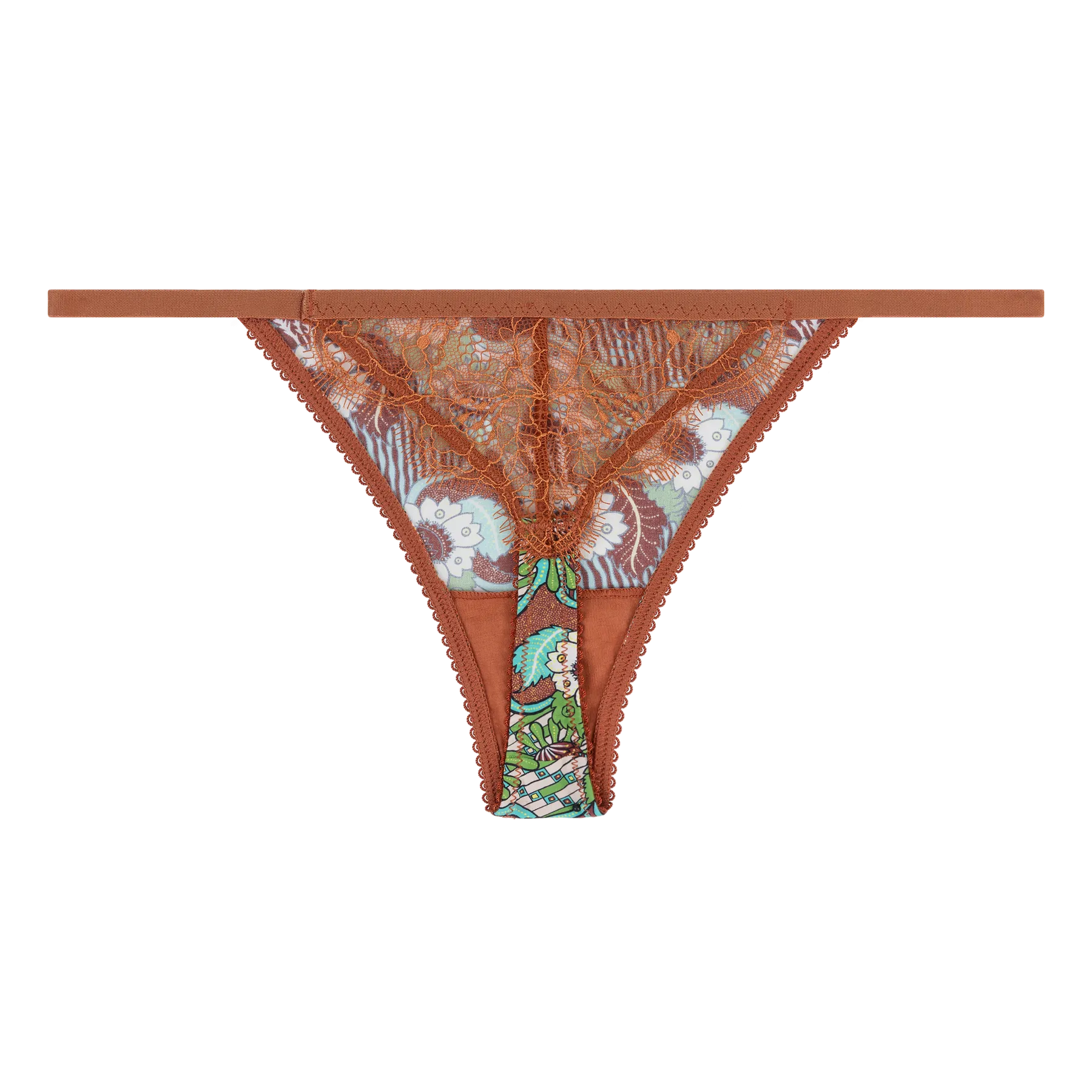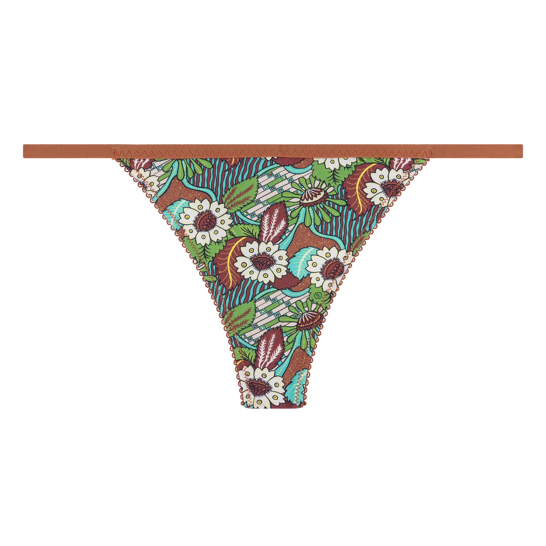 Зелена танга с флорален принт. Кафява дантела и кафяв ластик.
