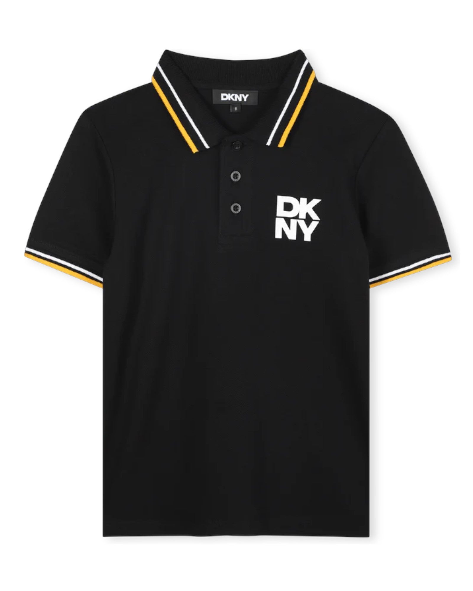 Черна тениска с яка, бели и жълти ленти по ръкавите и яката.