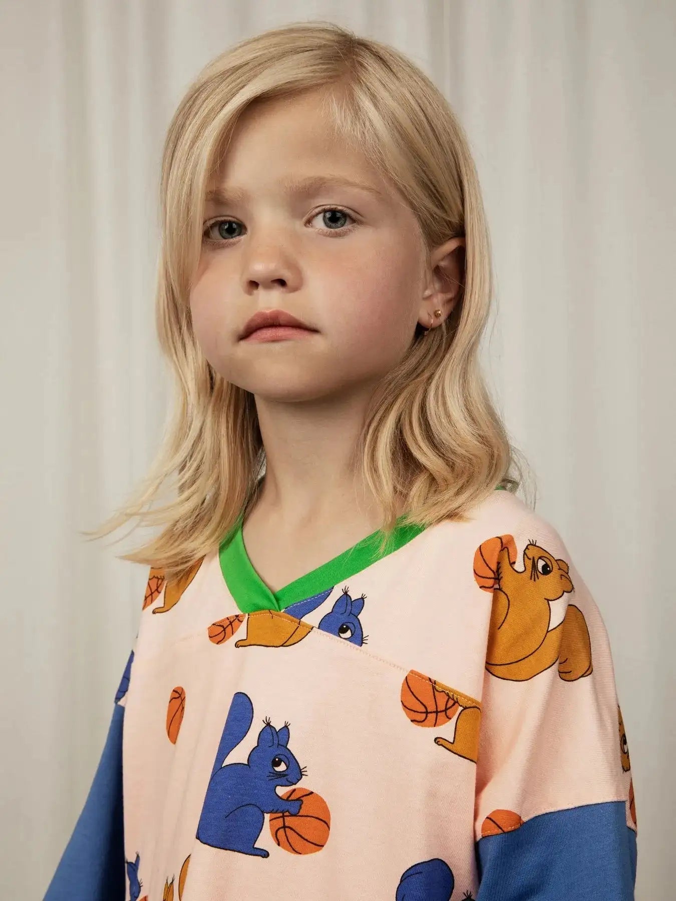 Розова широка тениска, принт от цветни катерички с баскетболни топки. Сини ръкави с контрастиращи зелени ленти по бието на деколтето.