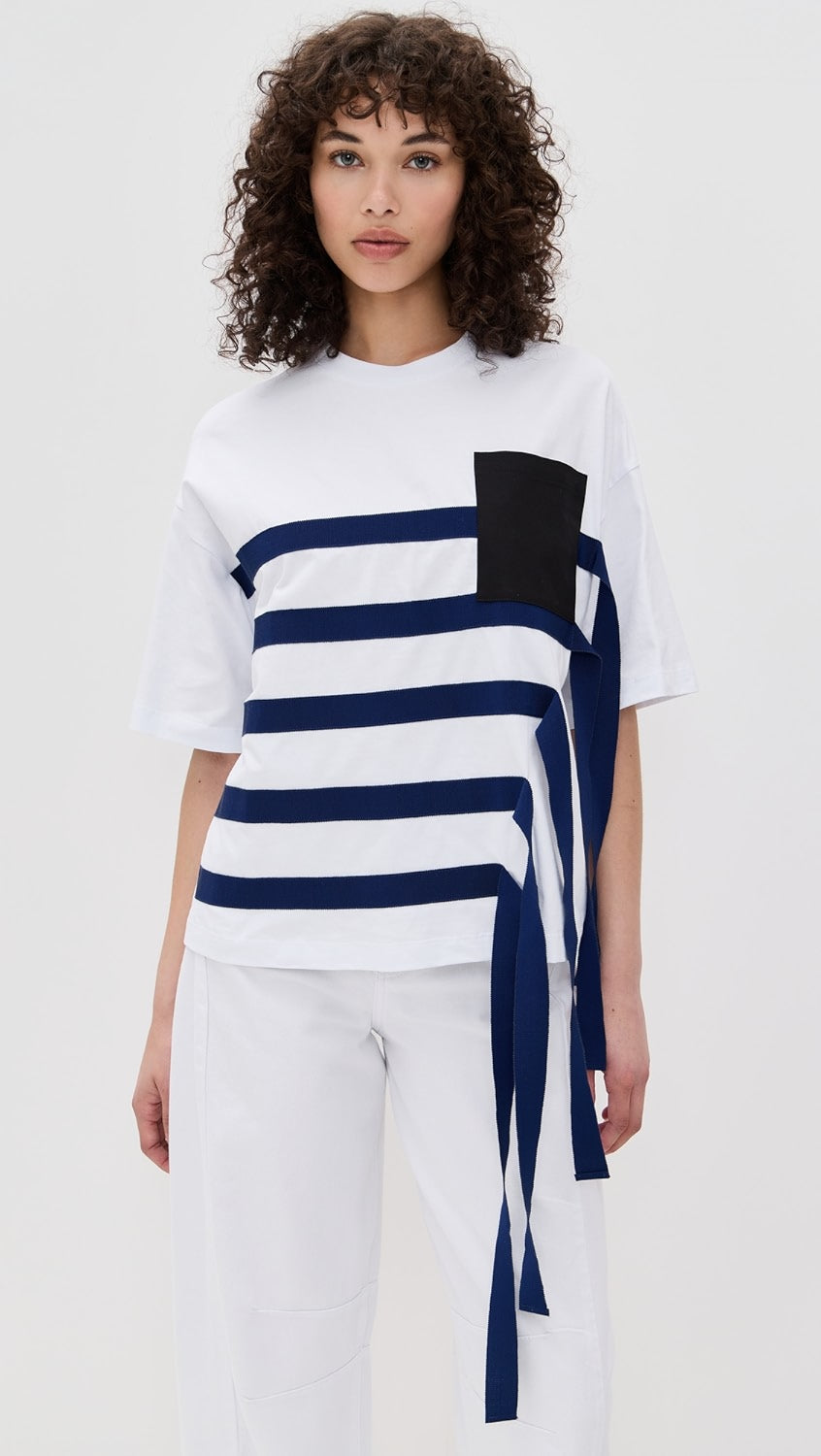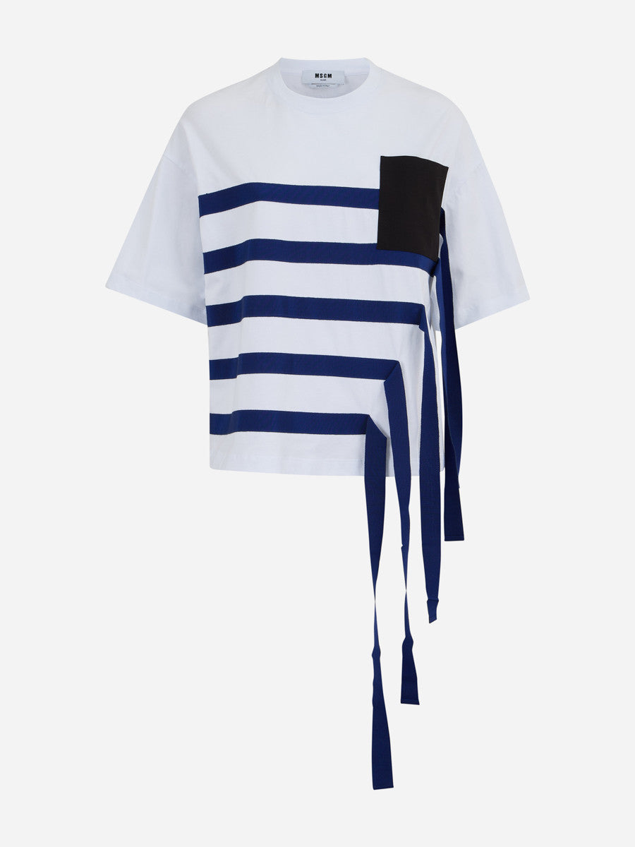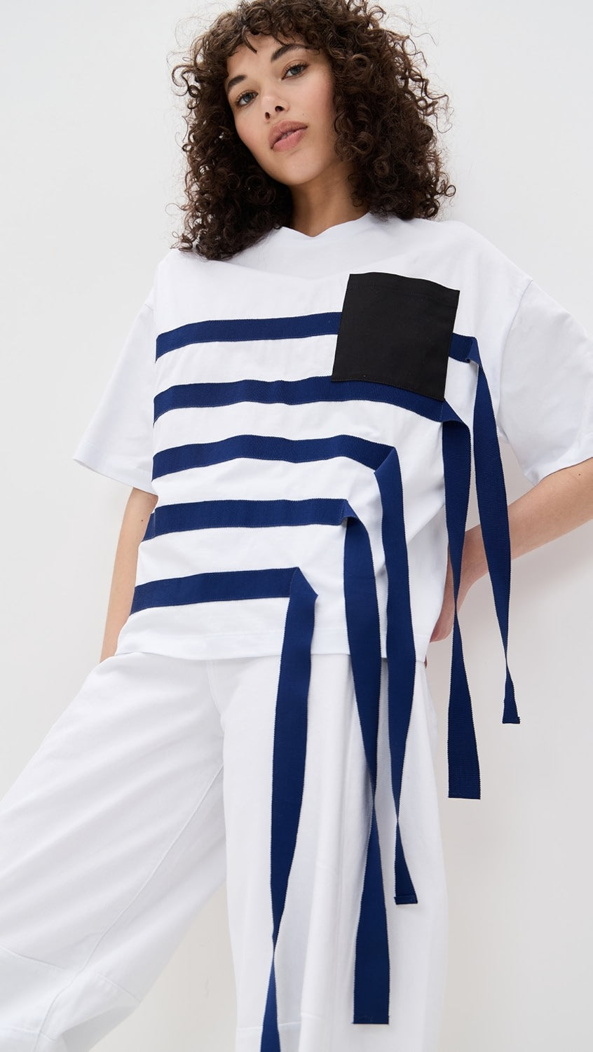 Бяла тениска, голямо синьо райе и сини висящи ленти.