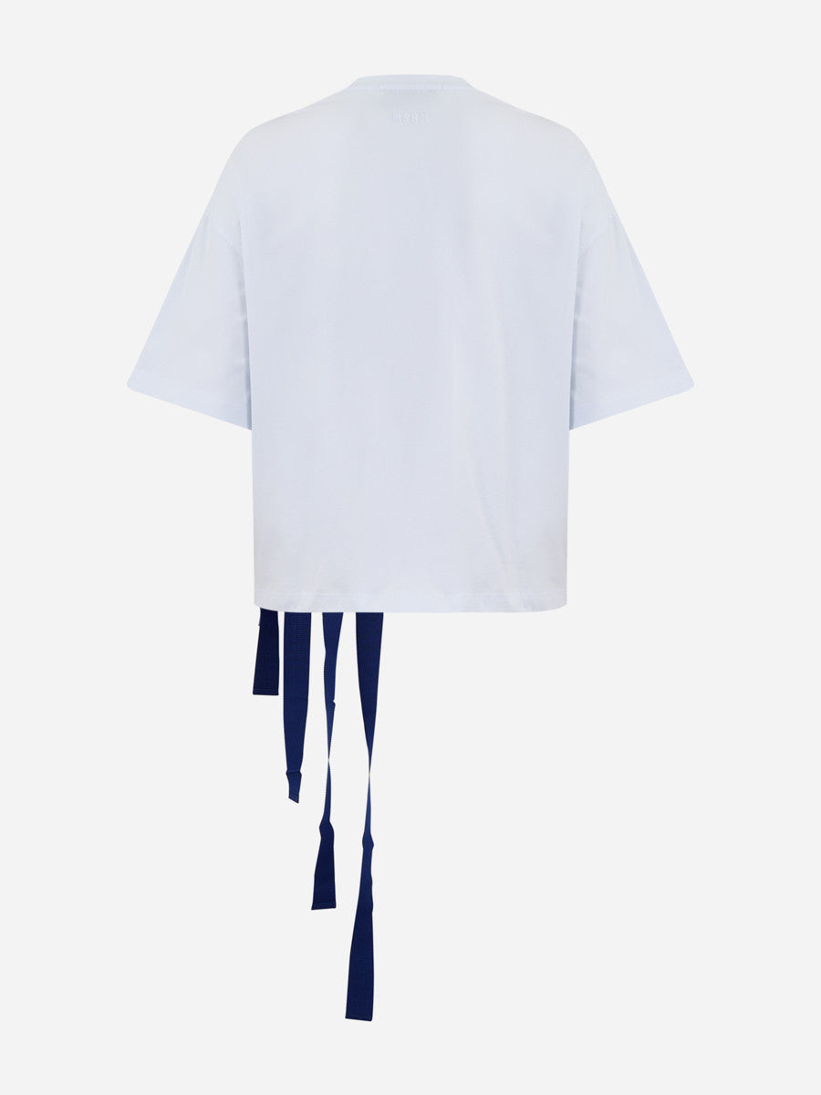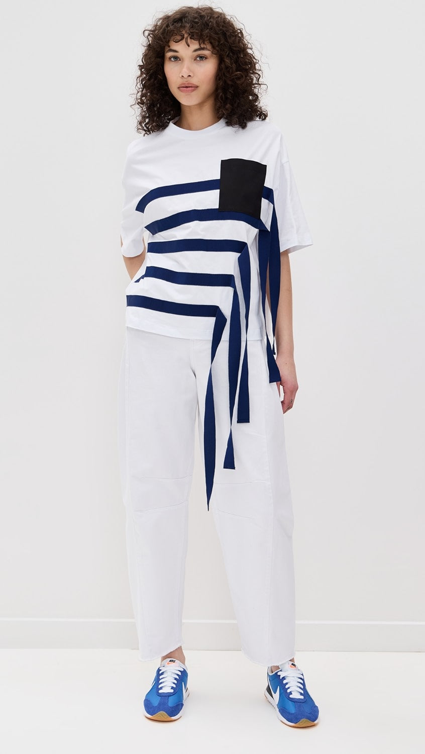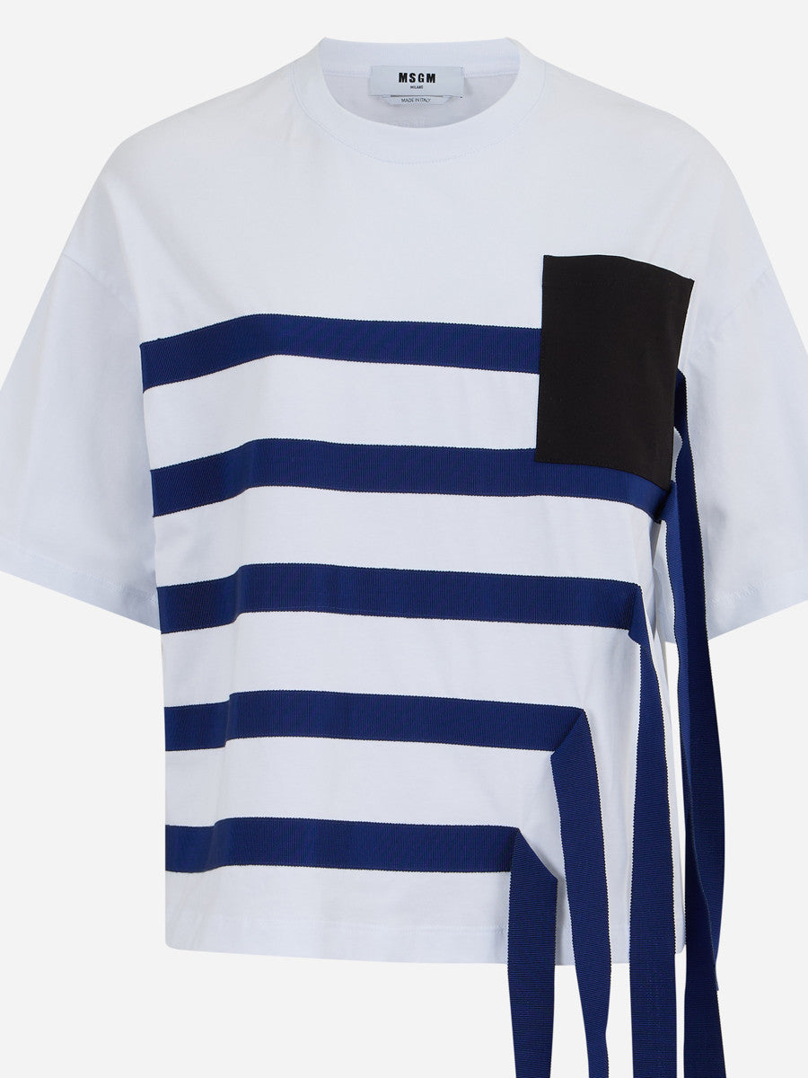Бяла тениска, голямо синьо райе и сини висящи ленти.